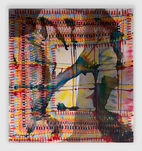 As if turned inward in contemplation, Beeber’s work resists immediate comprehension, obliging the viewer to interpret and search for shrouded meaning behind her heavily layered surfaces. Many of the works in Farbe present a puzzling nature, heightened by an elusive relationship to their titles; oblique and ubiquitous, an out of place obtuse angle appears on the left side of Left Hand Stitch, while Gravity’s Rainbow pours a rainbow that gravity has rendered a puddle. This game-like interplay of language and abstraction animates Farbe, lending a self-awareness to Beeber’s painted strokes and marks.
