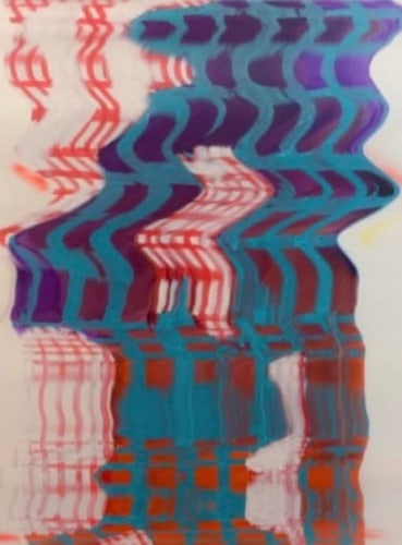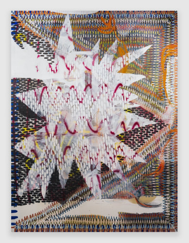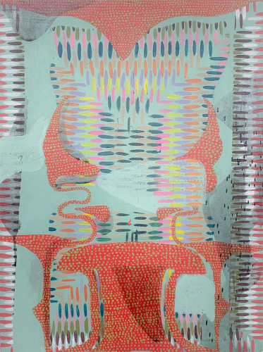 Immersed in this creative momentum, the works in Farbe are highly energetic, exuding the vitality and immediacy of the present. Kaleidoscopic layers of varying marks form a quivering harmony, as if vibrating with a hidden kinetic force. Beeber’s undulating surfaces evoke the momentary gestures and instincts of her process, encompassing both her self-described “kitchen sink” approach to form and color as well as the reflective, meditative turn of her repetitive marks. In Points Leading to La Sosta, the infinitesimal flux of distance between marks composing the piece’s central triangles lends a sense of frenzied euphoria, a moment of prophetic revelation. Here, in this flickering mirage, Beeber’s staccato patterns gain urgency, and evoke the elemental universality of cave paintings and other primal displays of expression.