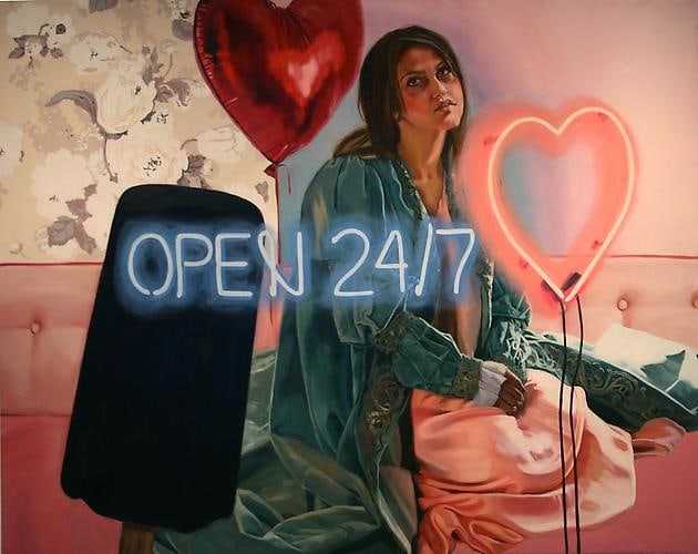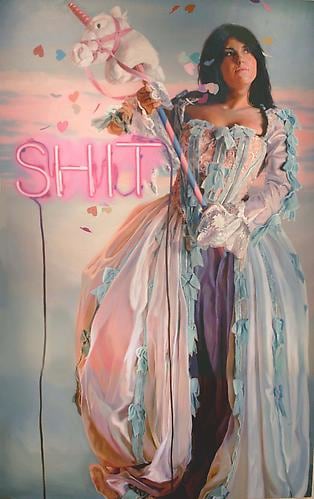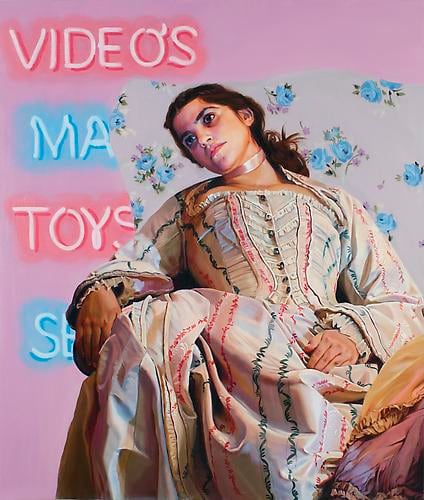 Panni, a recent grad of the New York Academy of Art’s MFA program, is adept at realistic renderings of these women and their costumes, but adds a strong sense of fantasy and illusion to her work. The portraits, simultaneously funny and serious, are fraught with tension, discomfort and idiosyncrasy, from the acute lighting, to the models’ odd expressions, to her choice of neon “tags” superimposed on the figures in the manner of thought bubbles. There’s also a soft quality to her portrayals, a style slightly out of focus, recalling 70’s soft-porn magazines. Indeed, Panni states that when she was 12 or 13 she discovered her father’s Playboys in a closet and kept it secret. She describes this as “a childhood memory that most boys have.” She became fascinated with Playboy magazines, in particular with how the women were posed and altered to appear how Playboy deemed women should be - at once artificial and perfect and sad. Because of her conservative upbringing (she was the child of an arranged, traditional Persian marriage) things like Playboy were very taboo; she wasn’t able to talk about sex and sensuality. Ultimately this resulted in a determination and desire towards uninhibited expression. Panni still collects vintage Playboy magazines and references the same controlled, manufactured, “directed” kind of feeling of the Playboy bunnies when she produces photo shoots on which her paintings are based. The women, while classically clothed, appear free and suggestive, in stark contrast to the repressed women of her past.