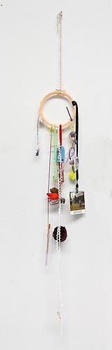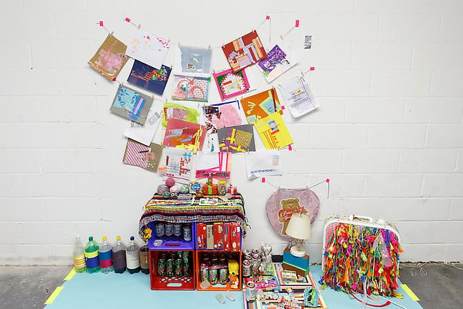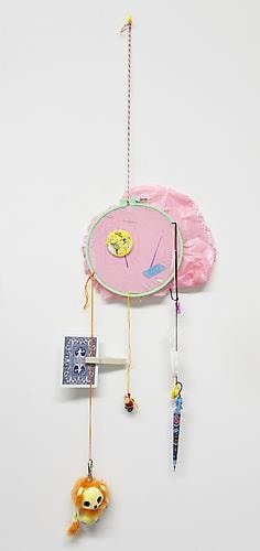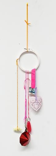 She writes “The title of the show is Good Luck because I am interested in power embedded in objects. The objects in the show are essentially my ideas of good luck charms. I think about the things that we save when we are children (in our treasure chests)--tiny scraps of paper, the things in your pockets, paper clips, strange drawings, ticket stubs, cracker jack toys...These things are so important as treasures to children and for adults they are the kinds of things that end up thrown away or in junk drawers.” Kelly plays the role of alchemist by converting these everyday, “useless” objects into art objects and material for her installations, and the results are joyful and liberating.