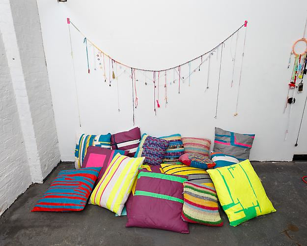 In the lobby, project, and video rooms this month we present another debut by a young woman recently graduated from Pratt’s MFA program, Kelly McCafferty. Kelly also explores the threshold between childhood and adulthood, but from a very different standpoint: her work at first glance is disarmingly childlike in its subject matter, materials and delivery – at once innocent and magical. Her show at F+V, titled Good Luck is multi-faceted. It consists of an installation of household objects – yarn, soda bottles, candy, applied stickers, milk crates - and drawings in the form of a shrine in the project room; a meditative shelf in the lobby holding six handmade artists books; and a 3-minute stop-animation video titled Orange You Glad (based on the classic knock-knock joke) complete with crocheted pillows on the floor as well as a bead curtain hanging at the entrance entitled Charm Bracelet. The artist describes her video as “an artist book, which moves.” Versatile with a variety of media, Kelly weaves a continuous thread in her work from books to video to installation to drawing and back to books again– taking the viewer on a participatory journey into a children’s playground of fun and fantasy.