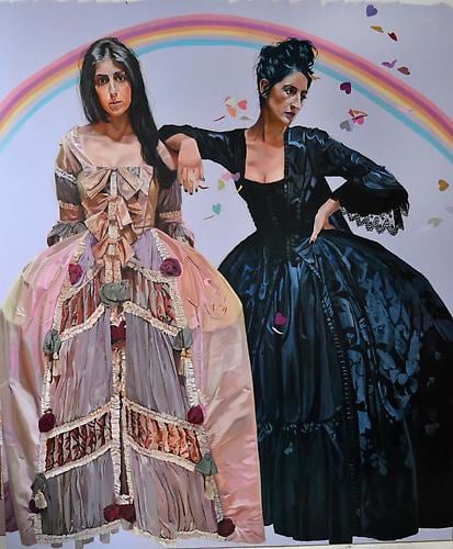 Panni Malekzadeh makes beautiful, complicated portraits of contemporary Persian women coming of age. What age exactly they are coming into is not entirely clear. The young women she depicts, mostly based on her close friends and family, are clothed in elaborate period costumes, as though they suddenly woke up in a strange land and time, and are seeking clues to clarify their sexual and cultural identity. They appear filled with an abundant mixture of embarrassment, sexual hunger, shame, confusion, delight, and dread.