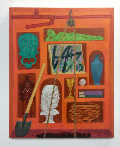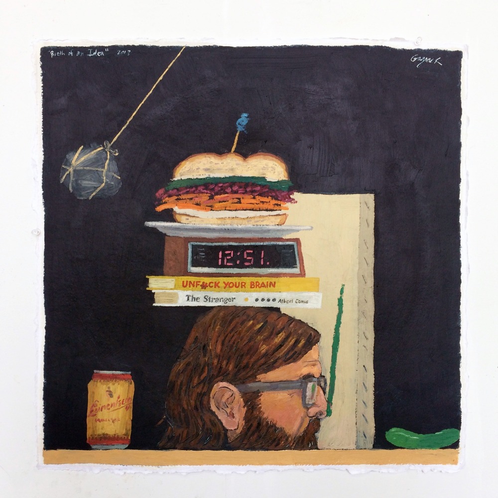 Though they are thoroughly integrated into his practice, the Howard Moseley book covers appear as a distinct body of work. Their dimensions are much smaller than Gagner’s other canvases, and their tone is dark and bleak, bereft of the glimmers of exuberance that populate the other works on display. Coping With Death conflates career stagnation with actual death, and depicts an artist painting a self portrait as a crying clown. Secret Societies and Insult Your Opponents cast the art world as a place of paranoia, treachery, and inequality; the latter takes aim squarely at critics, with the refrain Your Paint Handling Activates My Conceptual Gag Reflex highlighting the harsh yet capricious language that can validate or delegitimize an artist’s commercial career.