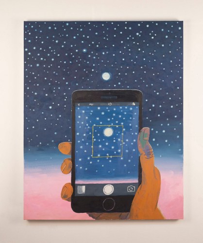 Gagner’s portrayals of the human form are rather incongruous in Holding Out For A Hero, oscillating from hyper-specific observation to freewheeling, surreal variations of scale. In Hairscaping and Barbarian and his Barber, his fixation on and isolation of hair’s physicality recalls the work of artists confronting the abject (such as Kiki Smith and Mary Kelly); however, the sheer absurdity of the mountain landscape shaved into the back of the subject’s head in Hairscaping suggests a more whimsical, playful direction to Gagner’s interrogation of the physical. In Palm Reader, tiny female hands probe the palm of a massive, statuesque hand. The bandaged fingertips and blue thumb of the hand suggest injury and distress, magnified to an almost Christ-like manifestation of human suffering.