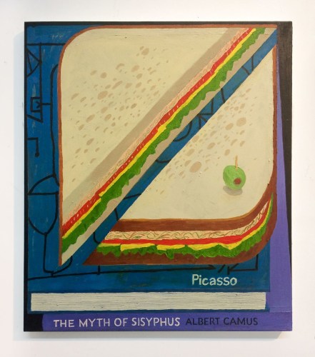 Several works on display depict oversized sandwiches juxtaposed with the spines of volumes by Picasso, Camus, and Baldessari, among others. Characteristically contradictory, these paintings at once appear to offer a nihilistic statement on the futility of culture, yet their execution suggests a different, less binary meaning. Gagner’s thick, corporeal brushwork and impasto technique transforms the bread and filling into rock-like slabs, and in Cheap Studio, he renders the raw materials of his creative process in a similarly concrete, radically painterly style, including even the leaking plumbing above his easel.