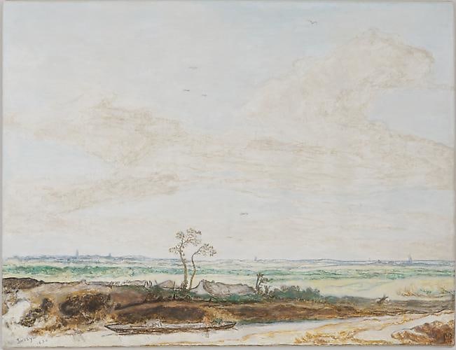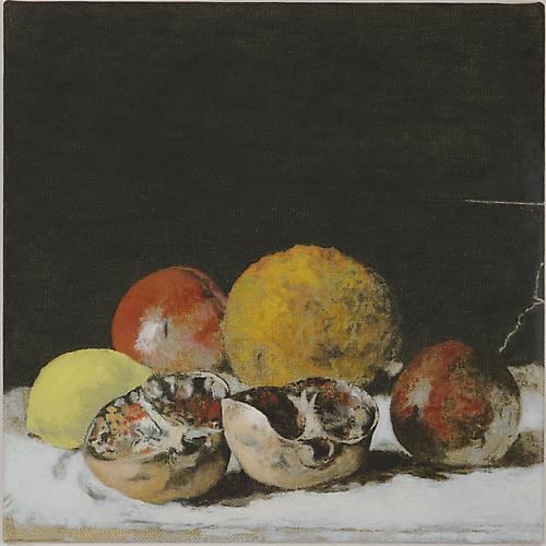 The canvases in Outer Space range in size and subject matter, even style, dramatically – from formal abstractions steeped in color theory, such as Viibryd, to lush, old master-style renditions of bucolic pastoral scenes and still lives. The majority of his larger abstract work is influenced by American pieced quilts, while scenes like Ithan Creek, At Ballybawn or Still Life with Pomegranate seem lifted from prints in dusty museum catalogs or nineteenth century artist collectives, with particular references to Courbet, Rembrandt and deMolijn. About the quilt-paintings, he writes,