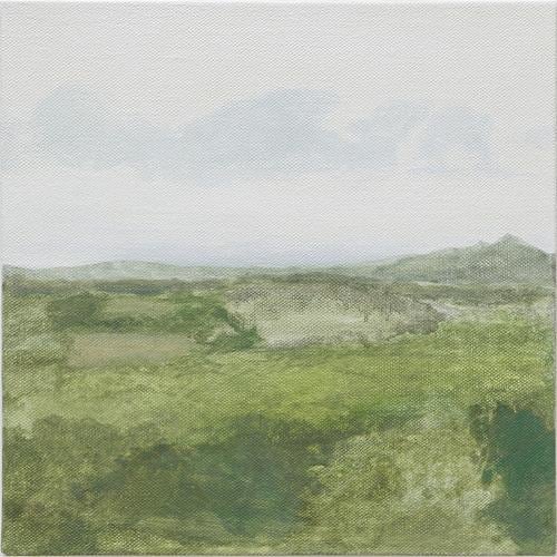 While the imagery in the paintings is varied, their scale and technique are consistent. Through an extensive process of layering and editing, remnants of previous paintings are often still visible on the surface, informing the final image. The modest size of the works, about one square foot, is intended to relate to the scale of the human head. The relationship between the viewer and these paintings thus recalls that between two faces, which creates an intimate understanding between the viewer and the painting.