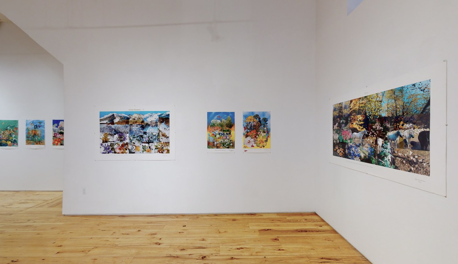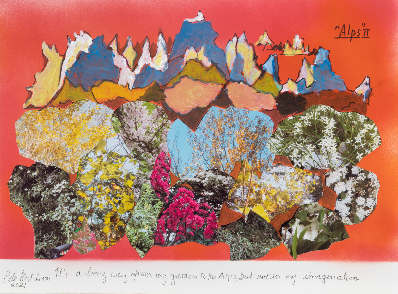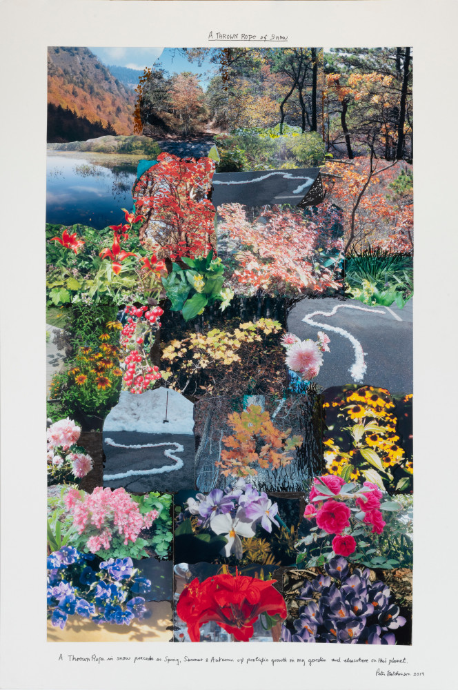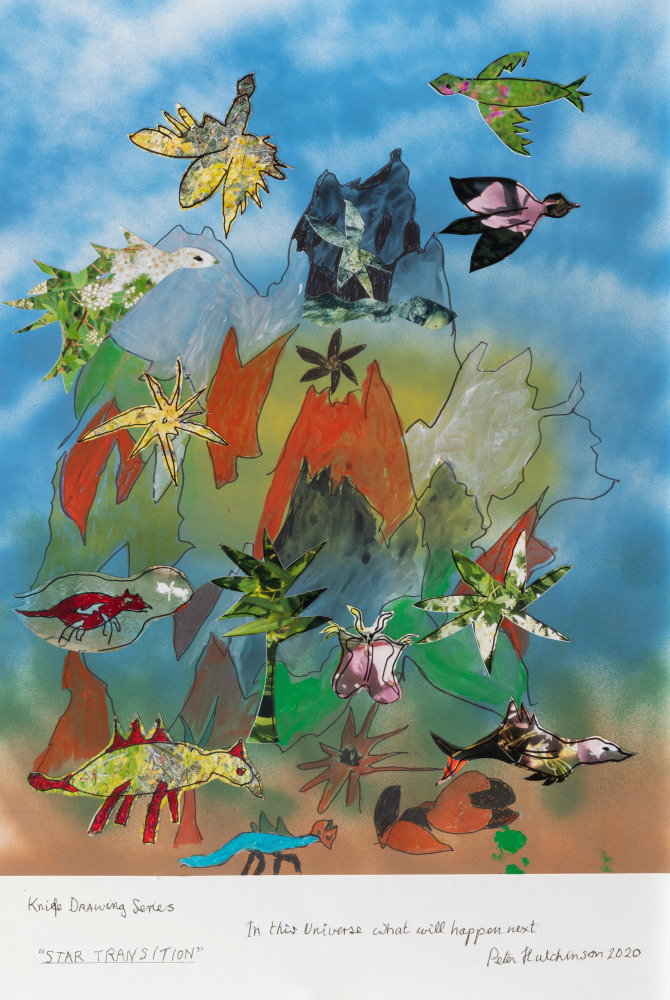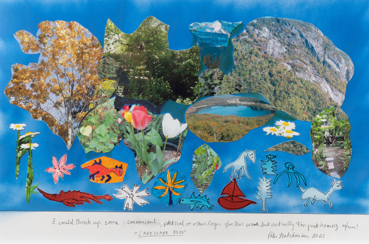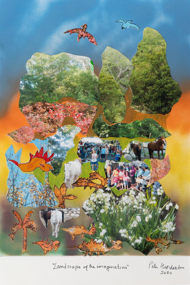 Hutchinson is at his most fanciful when he’s at his most literal—as the work Landscape of the Imagination (2020) illustrates clearly. In this piece, a skyey, multihued backdrop sets the stage for photos which have an almost documentary appeal to them. The saurian dragons and serpents drawn into the work are also less fanciful than descriptive, referencing the prehistory of mankind. Sharing a common visual surface with these hand-drawn elements are photographs of trees, horses, streets crowded with people, and white-tipped flowers. The merging of these different species and experiences, subtended by different media, showcases the common ancestry humans, animals, plant life, and dinosaurs all share. There’s a continual reference to the present moment in Landscape of the Imagination, to a unique “now” which constitutes the indigeneity of Hutchinson’s imagined landscape. Like much of his recent body of work, Landscape of the Imagination consolidates itself into a vignette, suggesting an imbricated divide between the scattershot way things appear to us, and the common origin experience has on the earth.