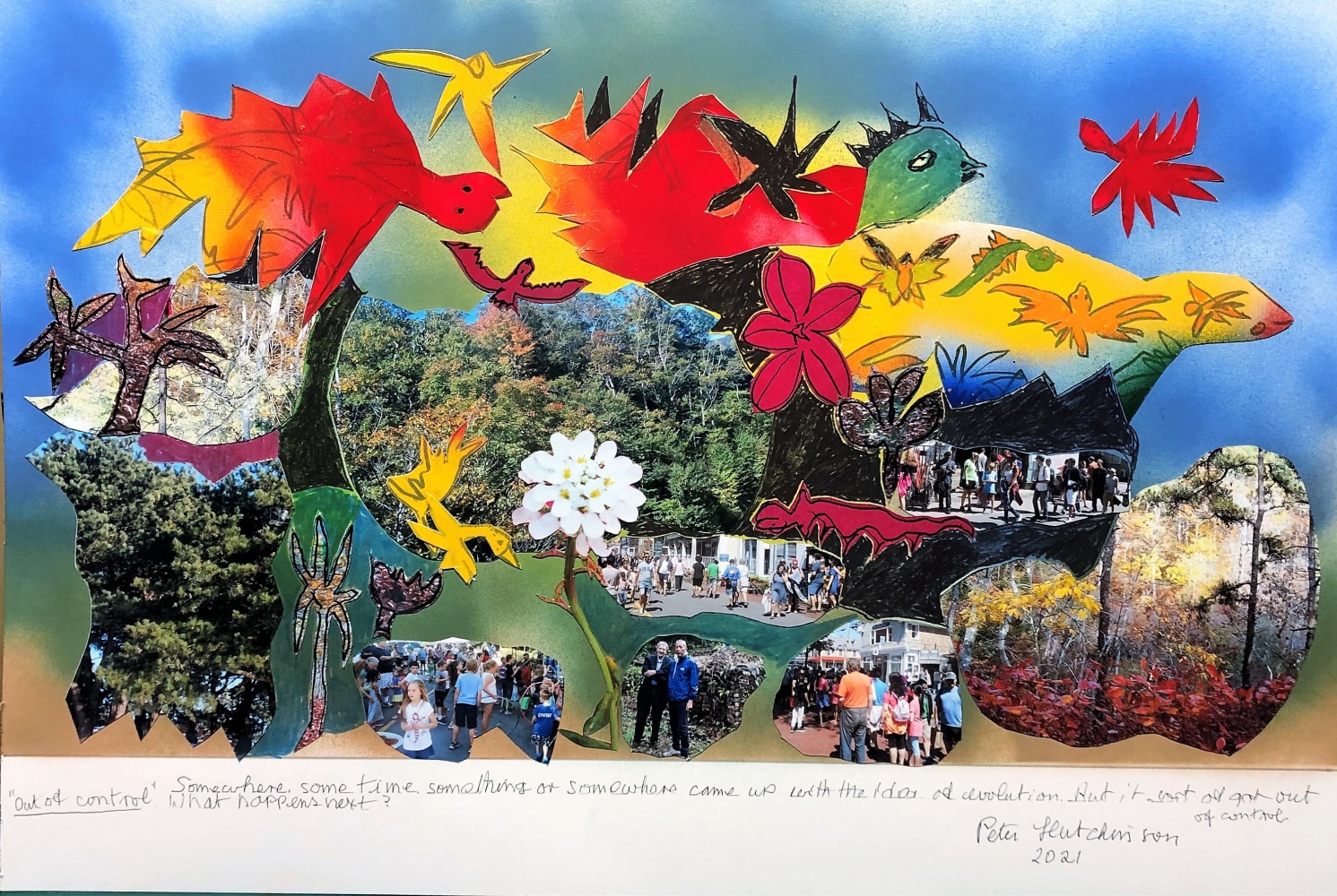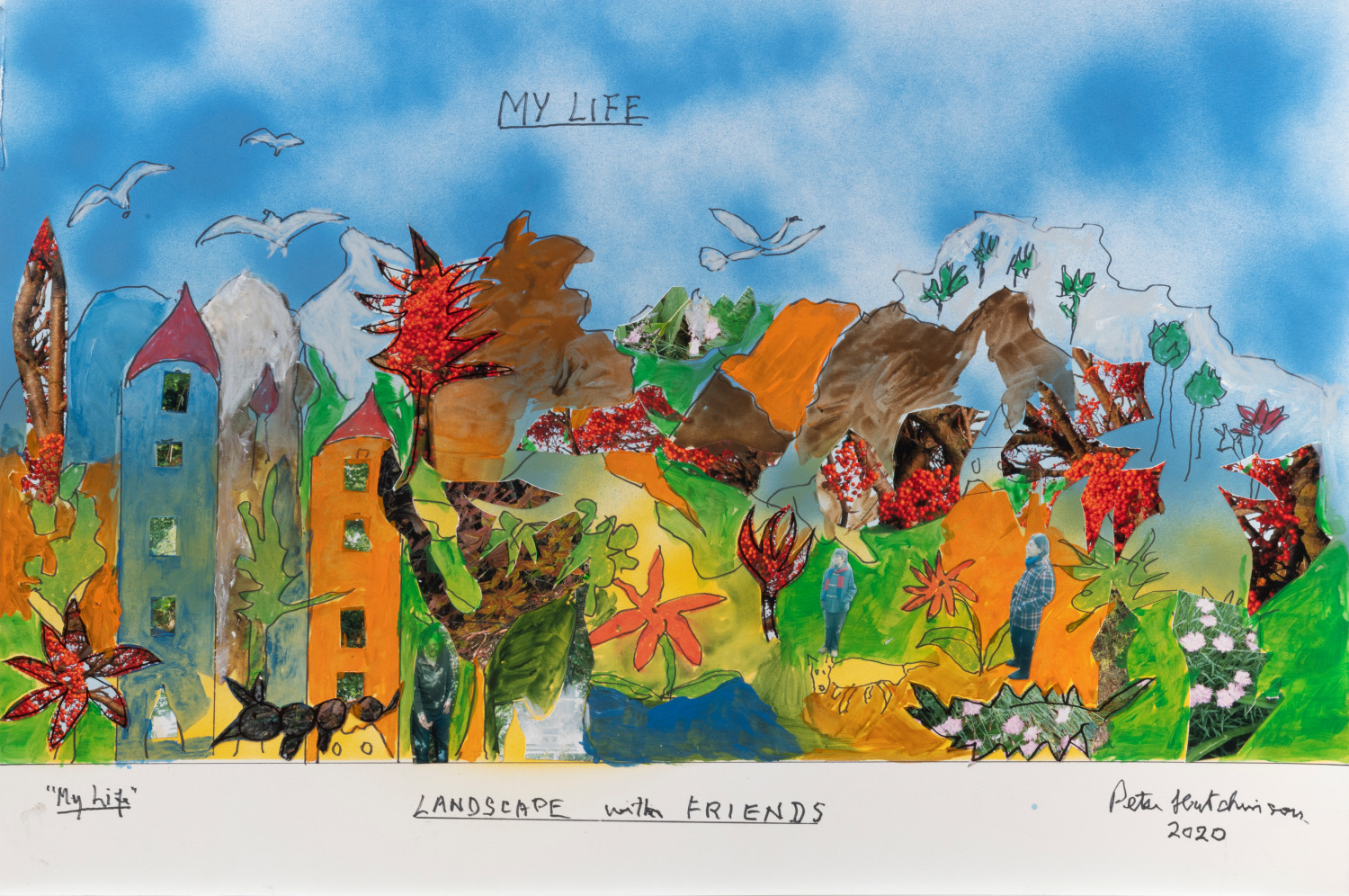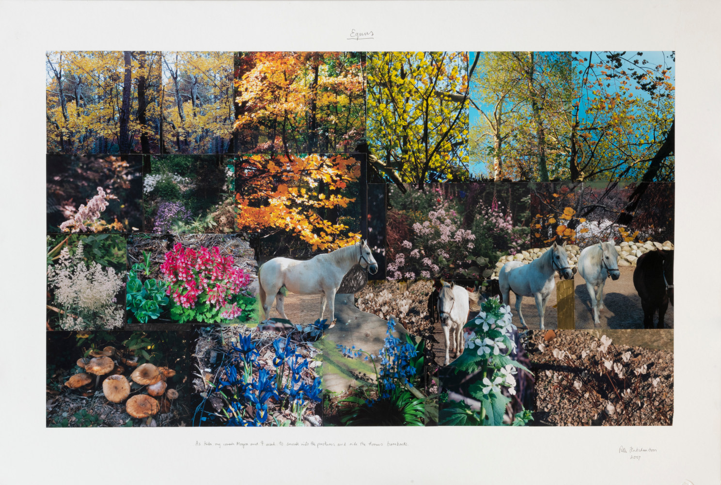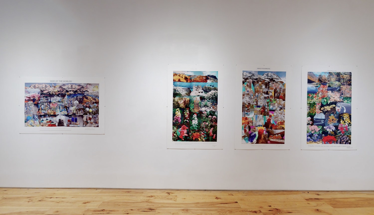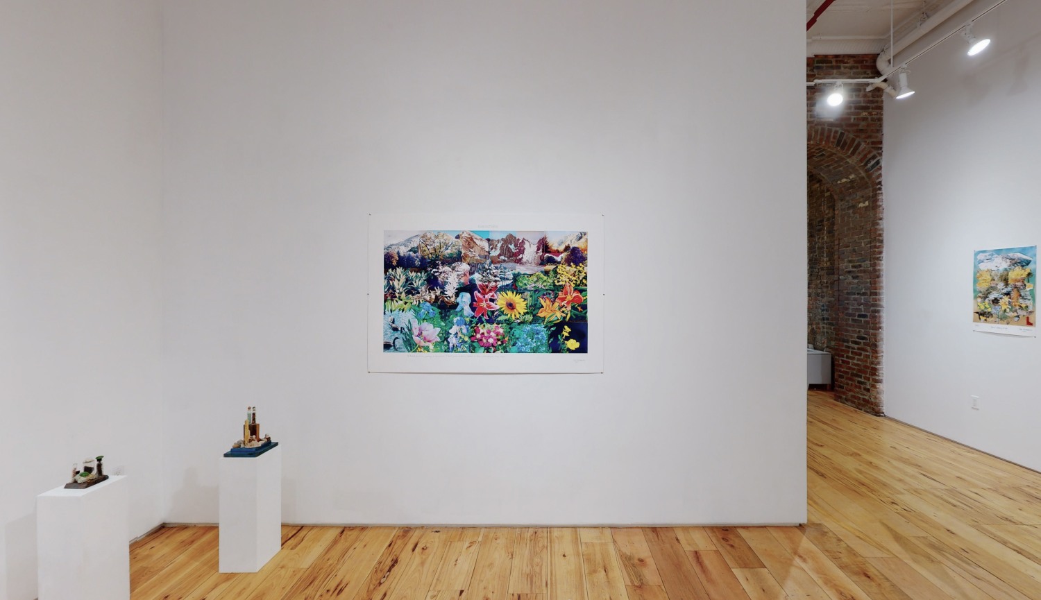 Hutchinson is at his most fanciful when he’s at his most literal—as the work Landscape of the Imagination (2020) illustrates clearly. In this piece, a skyey, multihued backdrop sets the stage for photos which have an almost documentary appeal to them. The saurian dragons and serpents drawn into the work are also less fanciful than descriptive, referencing the prehistory of mankind. Sharing a common visual surface with these hand-drawn elements are photographs of trees, horses, streets crowded with people, and white-tipped flowers. The merging of these different species and experiences, subtended by different media, showcases the common ancestry humans, animals, plant life, and dinosaurs all share. There’s a continual reference to the present moment in Landscape of the Imagination, to a unique “now” which constitutes the indigeneity of Hutchinson’s imagined landscape. Like much of his recent body of work, Landscape of the Imagination consolidates itself into a vignette, suggesting an imbricated divide between the scattershot way things appear to us, and the common origin experience has on the earth.