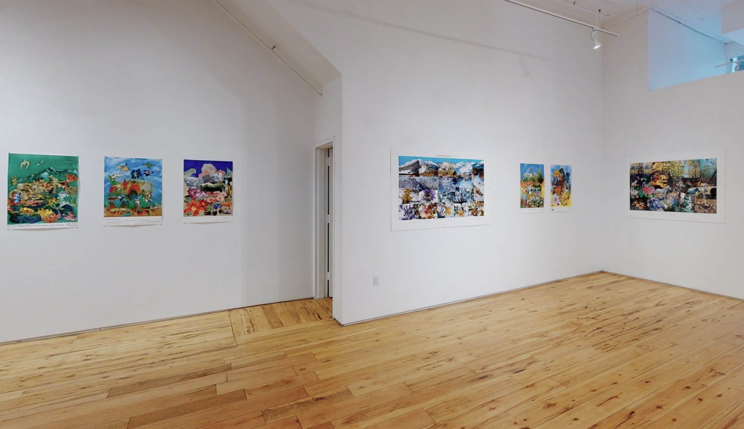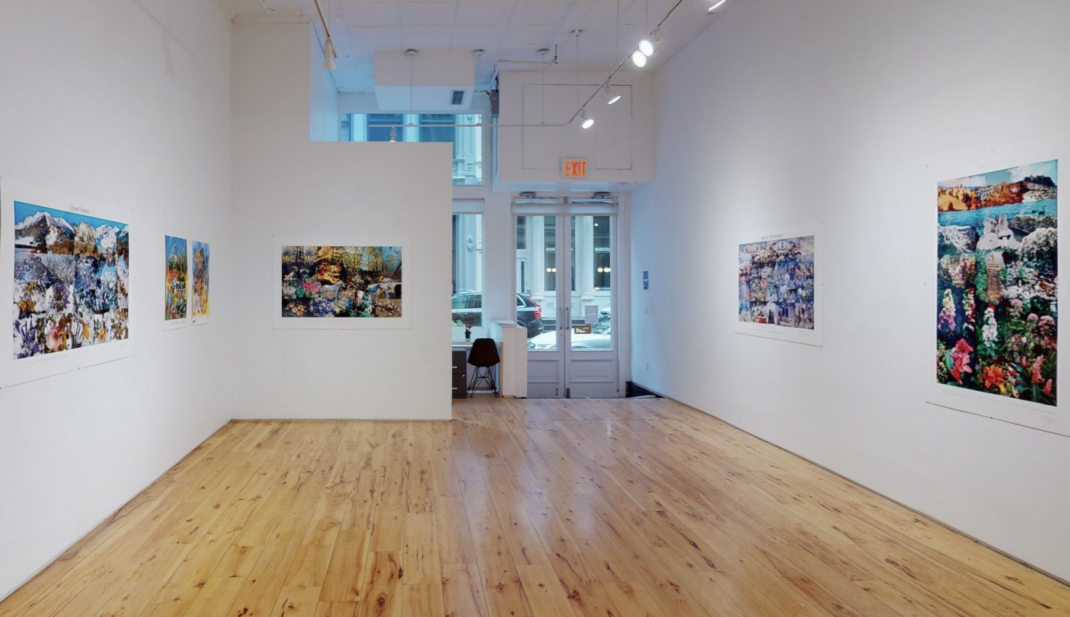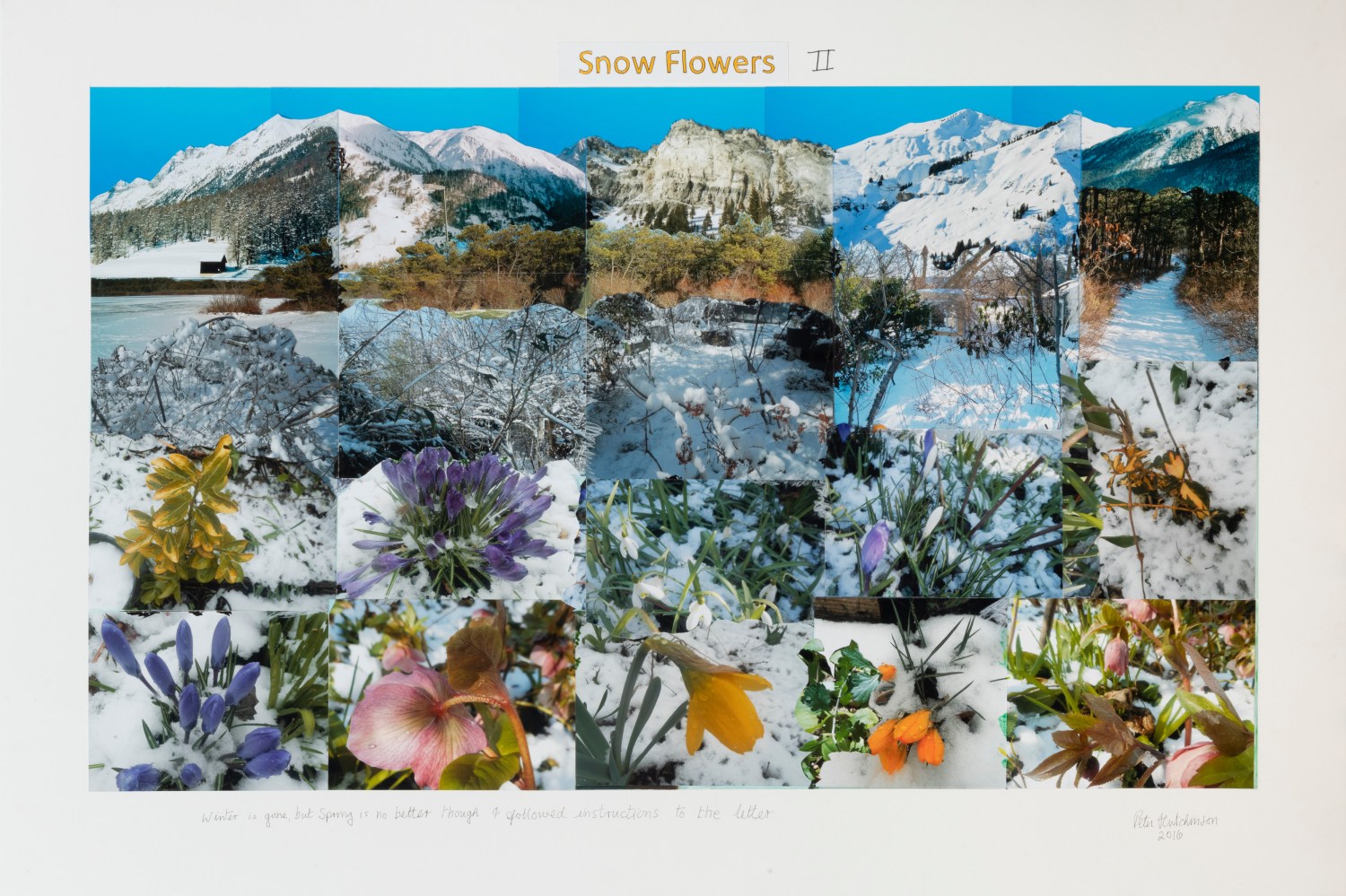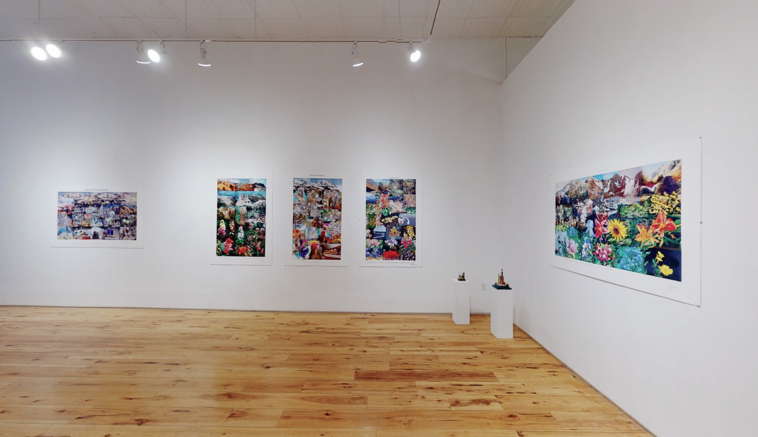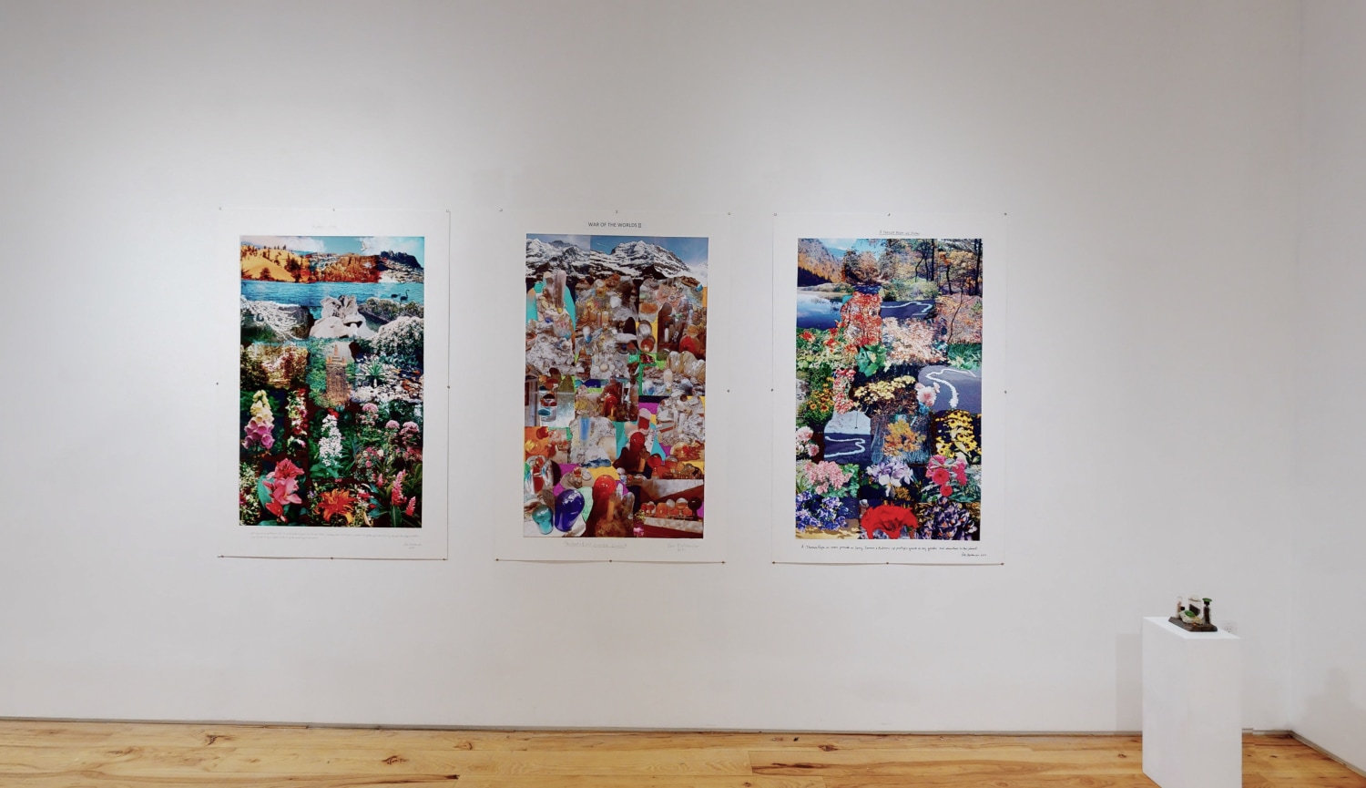 Hutchinson is at his most fanciful when he’s at his most literal—as the work Landscape of the Imagination (2020) illustrates clearly. In this piece, a skyey, multihued backdrop sets the stage for photos which have an almost documentary appeal to them. The saurian dragons and serpents drawn into the work are also less fanciful than descriptive, referencing the prehistory of mankind. Sharing a common visual surface with these hand-drawn elements are photographs of trees, horses, streets crowded with people, and white-tipped flowers. The merging of these different species and experiences, subtended by different media, showcases the common ancestry humans, animals, plant life, and dinosaurs all share. There’s a continual reference to the present moment in Landscape of the Imagination, to a unique “now” which constitutes the indigeneity of Hutchinson’s imagined landscape. Like much of his recent body of work, Landscape of the Imagination consolidates itself into a vignette, suggesting an imbricated divide between the scattershot way things appear to us, and the common origin experience has on the earth.