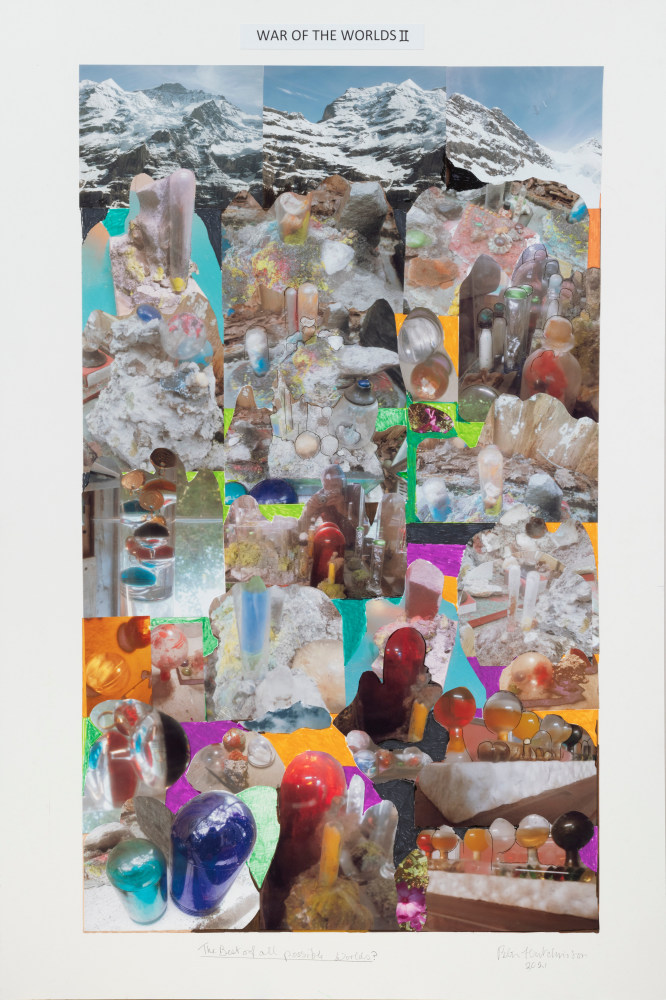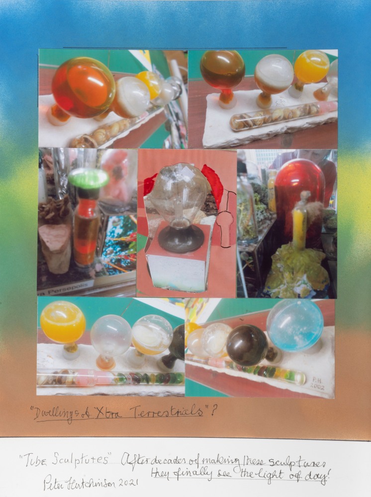 Hutchinson’s earth is like an ever expanding sound stage, a setting for both real and imagined voyages. The fact that his take on indigeneity incorporates otherworldly constructions as much as snapshots of our world, only makes his work all the more anthropologically astute. His Tube Sculptures, for example, are not less tellurian for alluding to modes of intelligence which exist apart from human life. A caption under one such work reads: “After decades of making these sculptures / They finally see the light of day!” This almost puts them on the level of spaceships: perspectival machines through which we can glimpse the workings of another planet. The fact that these sculptures are made of quotidian elements only enhances their air of mystery. Are these alien landscapes caught inside glass spheres? Is the matter roiling about inside them extraterrestrial? The diminutive scale of Hutchinson’s tube sculptures equally raises questions about the proper way to record and archive indigenious existence. On the one hand, you don’t want to alter the integrity of the lifeforms you’re describing; nor destroying nor augmenting them. On the other, you’re not just describing them either. You need to recreate them in some way, eschewing all reductiveness and exaggeration.
