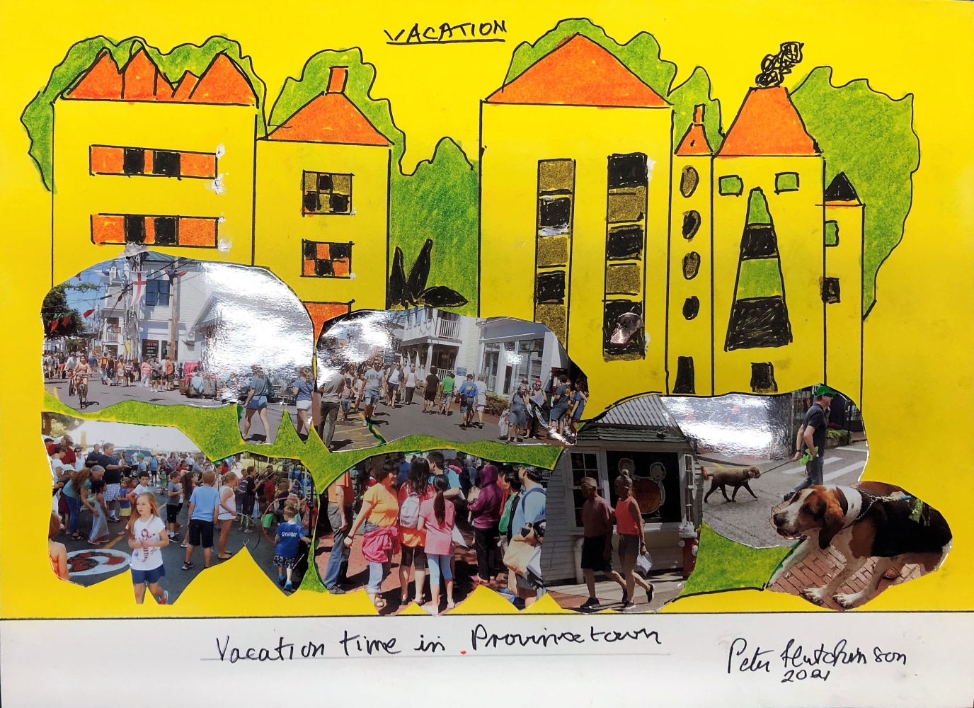 The multi-tiered buildings in Vacation, which seem almost childlike in their exposition, reflect the summery joy of the people collaged into the work. At the bottom of this parade of activity, there’s a caption that reads, “Vacation time in Provincetown.” What’s interesting about this caption is the way it ties together diffuse pictorial elements. As a classificatory gesture, this caption serves to highlight the business and excitement pervading the whole work: a flaunting of its constructed essence which, ultimately, constitutes Vacation’s aesthetic allure.