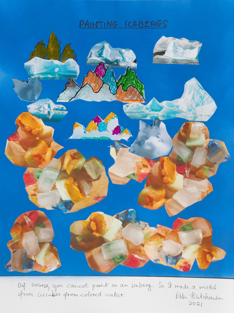 Hutchinson’s use of collage suggests an interrelationship between the imaginary and the real, the territory and the map. Just as his tube sculptures evoke secret fluorescences hidden in the mantle of the earth, his more pictorial works like Vacation (2021) suggest that there are easy-to-overlook synchronicities between desire and perception. The way Vacation quite literally spells itself out, in underlined letters at the top of the work, implies that more is happening than a simple leisurely trip. To my mind, the real crux of the work lies in the way Hutchinson uses layering. There’s at least four different kinds of imagistic tools, or layers, used here—each being a different form of mark- or picture-making. Each has its own temporality, its own point of origin; but they all come into confluence around how they collectively recreate an experience of being in Provincetown.