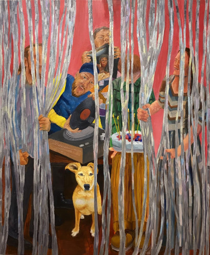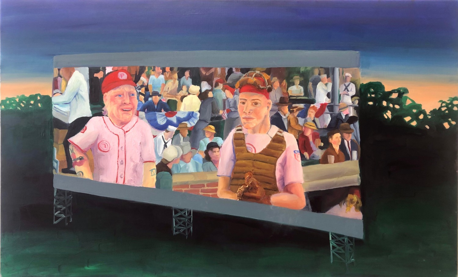 Relatedly, the paintings of Tony Bluestone, such as A League of “Their” Own, unpack like a strange, defamiliarized reflection staring back at the viewer. In wry, subtle ways, the significant details of the painting, however familiar at first sight, can only provoke surprise. The spectacle of queering a movie about baseball is transcribed in terms of a frame within a frame, which only serves to highlight another, ongoing reality working to shape itself beyond the viewer's line of sight.