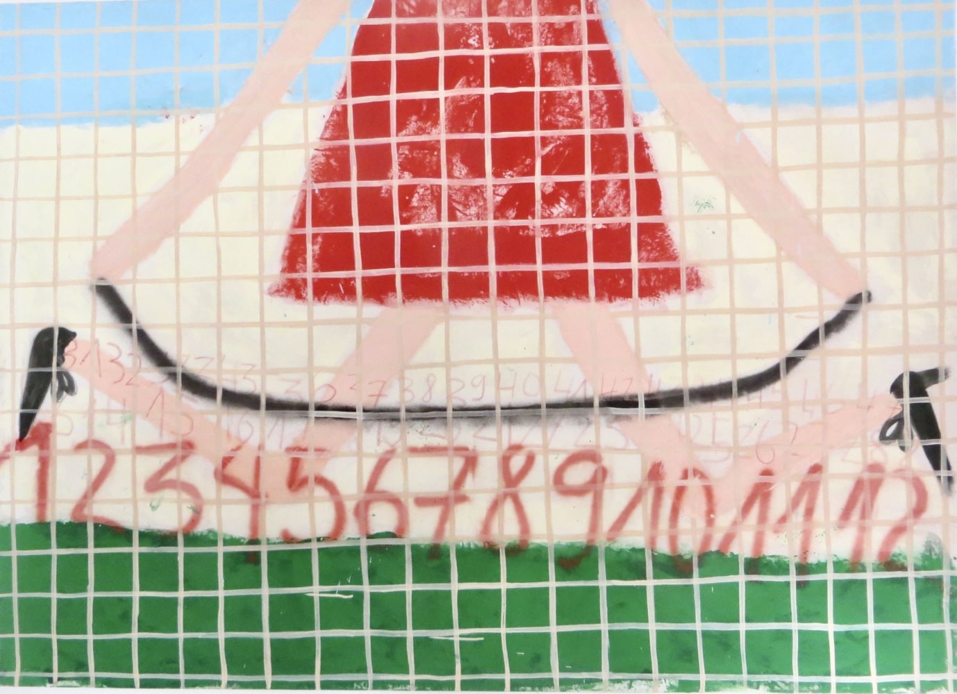 Gabrielle Graessle's paintings openly display a kind of hypercathexis where the symbolism of language, coupled with the entrancing aspects of consumer goods, combine in the manner of a painterly sigil. Utilizing crafts-like, almost plastic materials – such as acrylic paint and glitter – her painting 123456789101112 shows the truncated torso of a girl jumping rope. The numbers displayed in the picture are like thought balloons, synesthetically enumerating the girl’s movements up and down. Another of Graessle's paintings, Birkin Bag, comes alive with bright, almost fauvist-inspired colors. A furtive sense of animation reaches across the grid where Graessle's Birkin Bag has its place. Like a living object, the words written on the canvas seem to call out to the bag, highlighting its physical absence while summoning it into being.