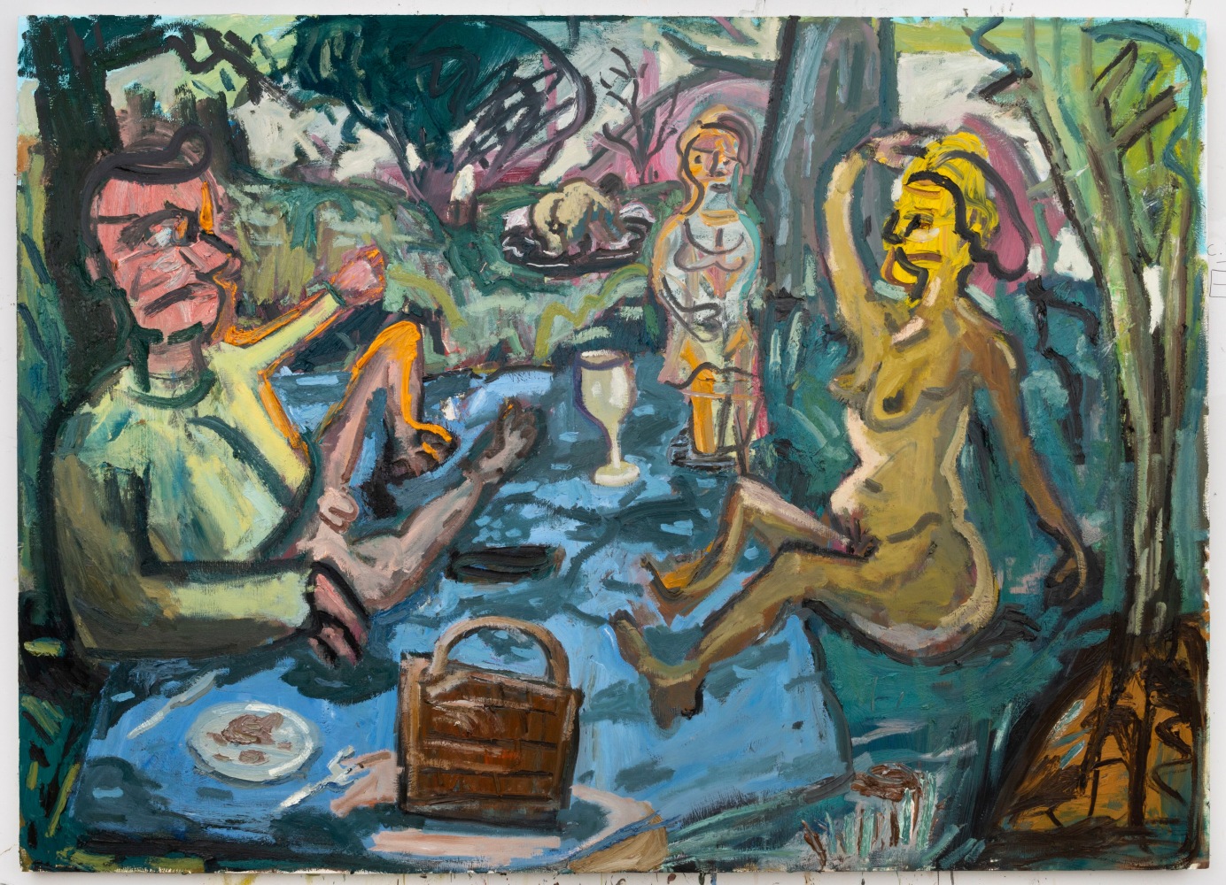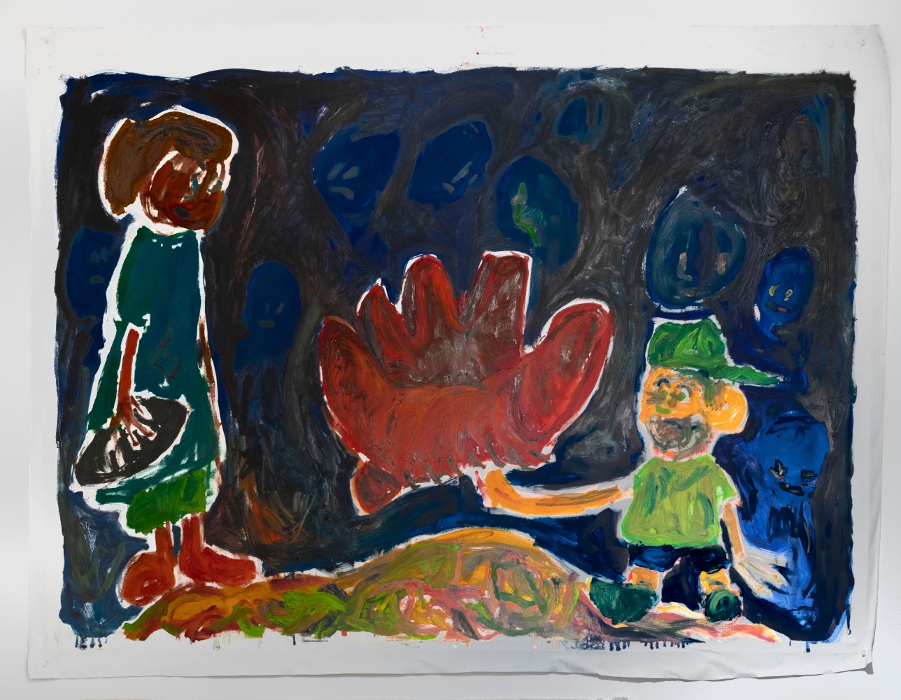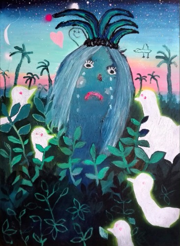 With their pastel hues and crude forms, Fullana’s canvases radiate a saccharine, childlike sensibility that is offset by her often garish and explicitly sexual subject matter. In All Inclusive and Fountain, she presents sex as a sort of commodity, detached from emotion, recalling the hyper-sexualization of teens and society as a whole. Paradise Birds presents a surreal scene wherein a disembodied, distorted female head hovers above a jungle; surrounded by glowing white birds, the subject appears simultaneously distressed and transcendent, reflecting Fullana’s ability to draw seemingly mundane imagery into larger dialogues. Juxtaposing sentimental scenes of children playing baseball with apocalyptic backgrounds suggesting nuclear devastation, Hüppauff’s paintings similarly blur the lines between nostalgia and anxiety, obliterating innocence with the extreme outcomes of war, and force the question of whether children coming of age in contemporary society still have the possibility of experiencing a true childhood.