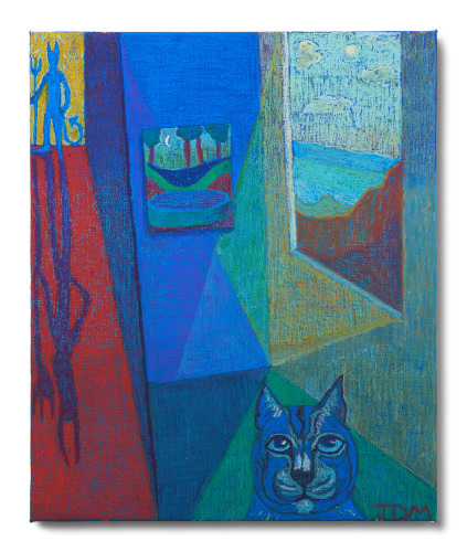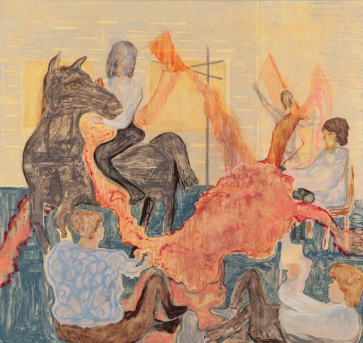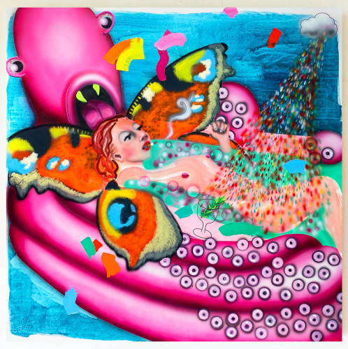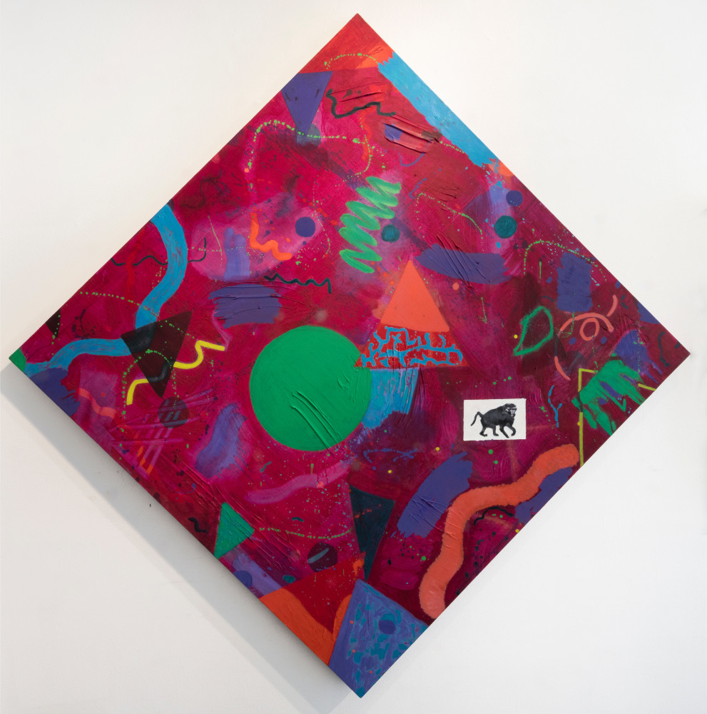 Amidst the manic, theoretical conjurings and dreamscapes of Pungent Dystopia, Sam Bornstein’s Pink Flag stands as a flare of clarity, marking both the exhibition’s grounding in day-to-day life as well as reaffirming our individual sovereignty and ability to work as agents for change. Appropriating traditional revolutionary imagery, muted with pink and lavender tones, Pink Flag presents a vision of progress linked to the fundamentally transformative power of the individual. Pungent Dystopia chronicles dysfunction and injustice in the world, but ultimately, as in paintings like Pink Flag, has more than just an apocalyptic message - optimism, love, and hope are manifested, and conveyed by the artists, for the planet, and for mankind.