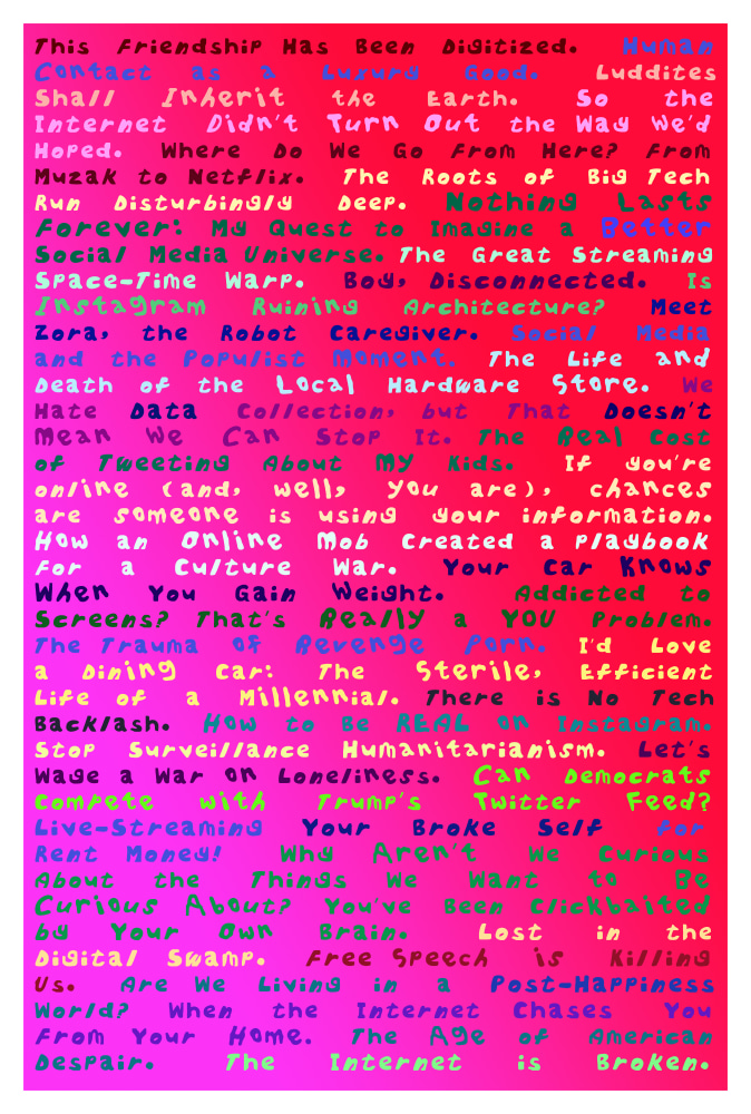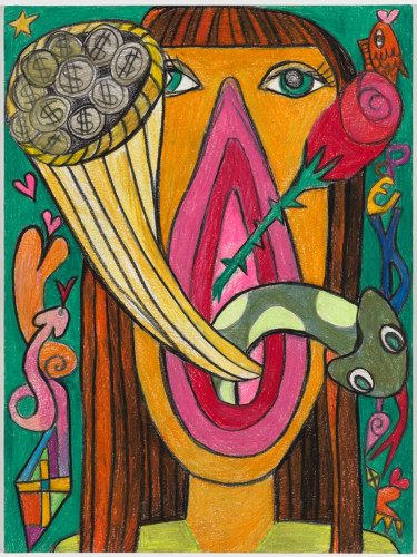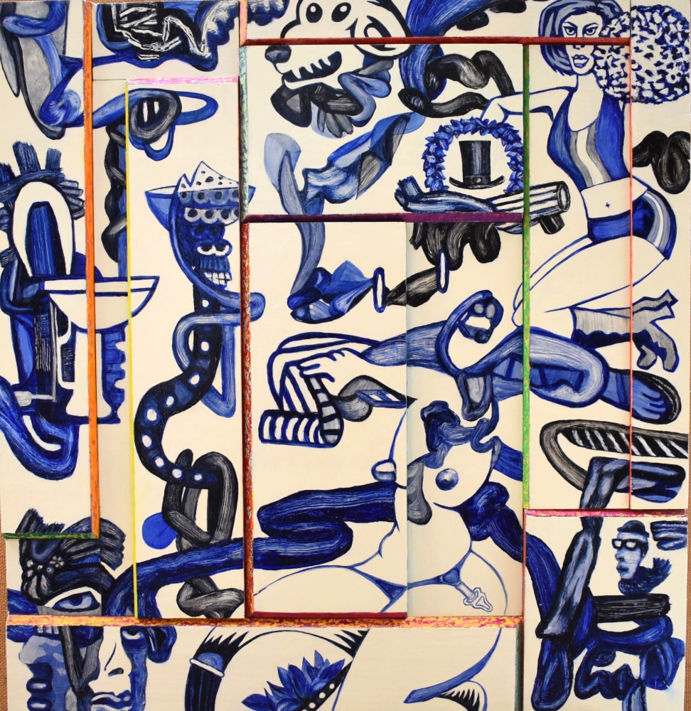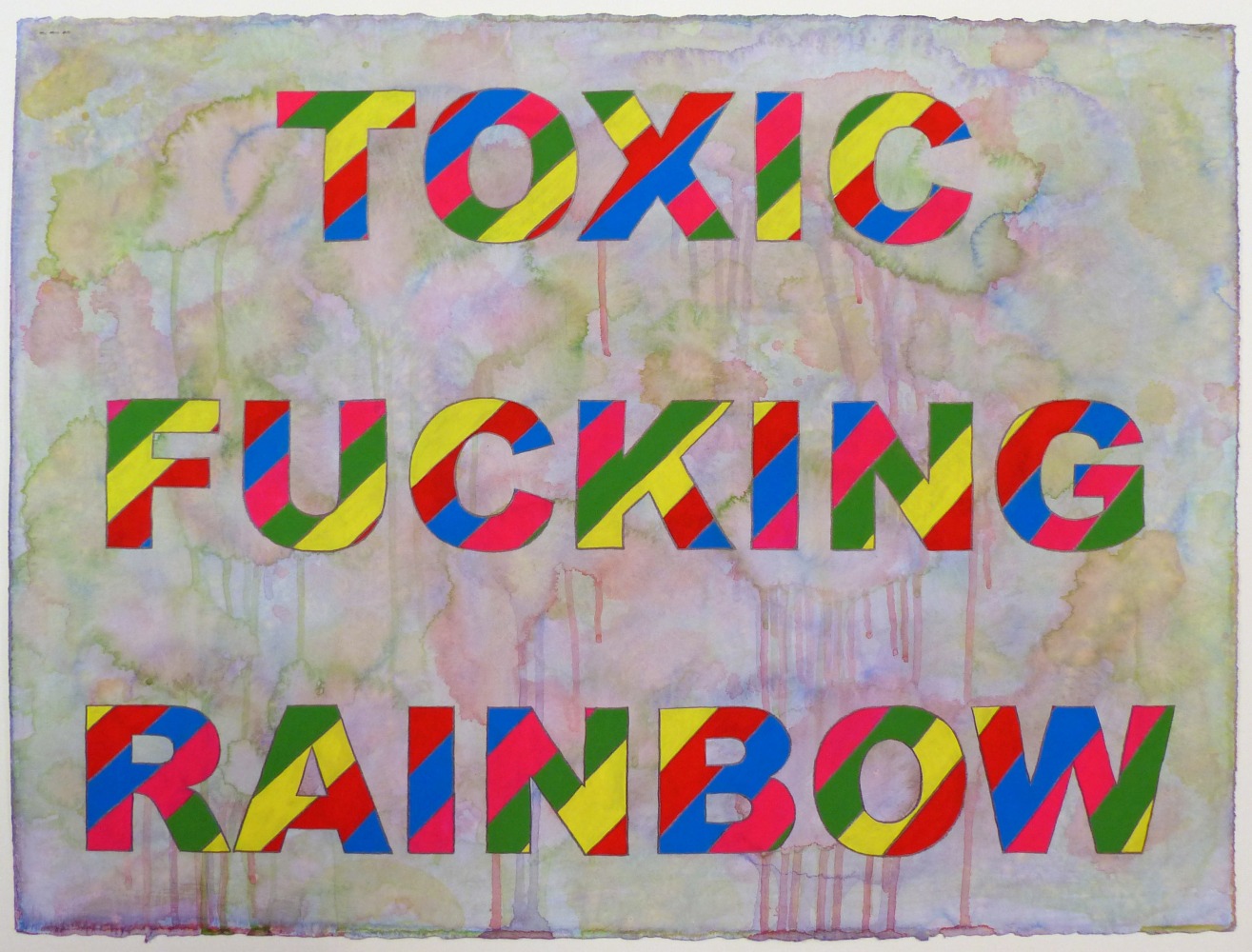 Confronting the dysfunction and uncertainty of modern society, the works on display in Pungent Dystopia embody aspects of escapism and fantasy across alternatingly text-based, figurative, and abstract pieces. Paralleling our “post-truth” political climate, marked by deception, misinformation, and media manipulation, the artists included in the exhibition dive headfirst into their respective aesthetic constructs, deconstructing the precarious state of contemporary society with its own mechanisms. On the other hand, Jablon and DiLeo’s purposely jumbled, disorienting compositions, grounded in text and abstraction, respectively, provide visual analogies of hyper-stimulation and a world in which even journalistic facts are called into doubt.