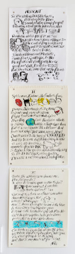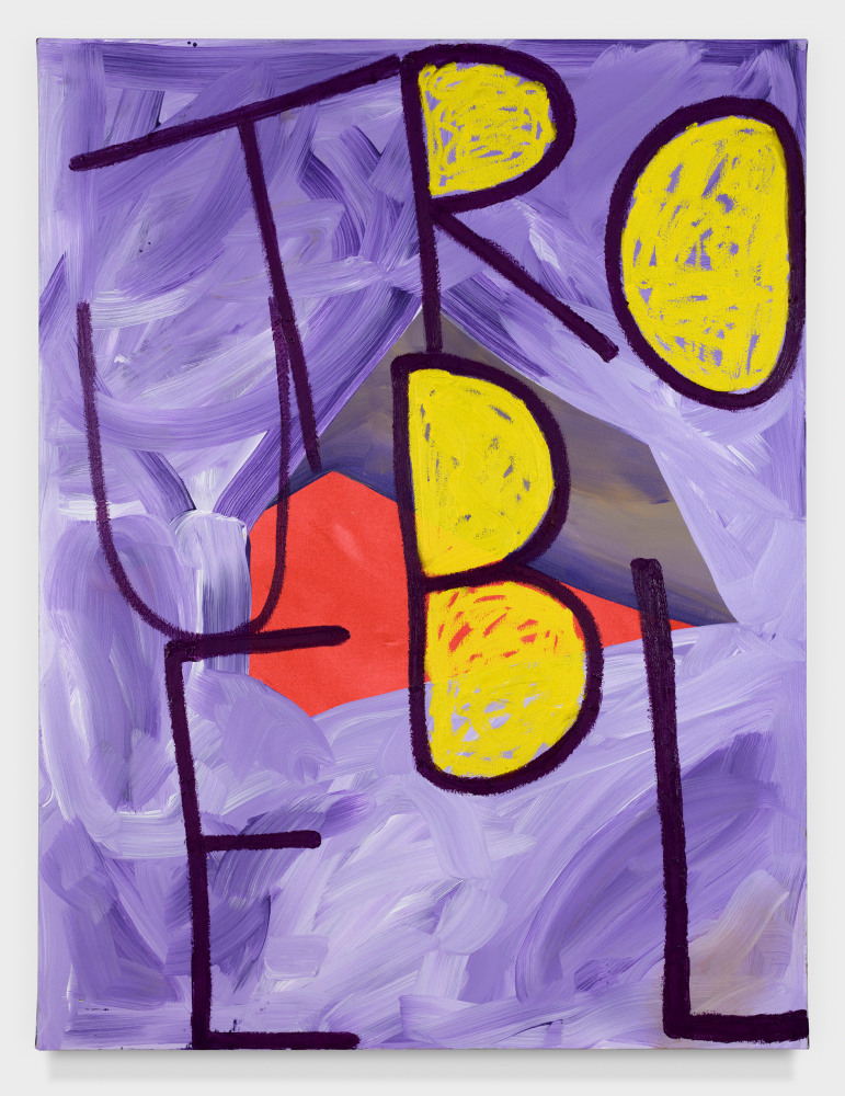 Weaving abstraction and figurative forms within his geometrically divided panels, DiLeo’s work expresses the vacuous gulf between fact and fiction that has come to define our current political climate. However, he molds this malleability of truth into a creative tool, constructing riddle-like networks of strange, psychedelic forms. In Trouble and Delicious Life (II), Jablon skews the spacing and orientation of individual letters, opening his snatches of text to vastly divergent interpretations. Emphasizing the physical forms of each letter to the point that they take on their own meaning, Jablon’s similarly appears to ruminate on the dissolution of unequivocal meaning and truth in contemporary life.