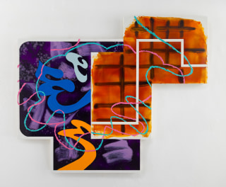 In It Makes You Go Whooh the work merges spirited marks with the structure found amongst the artist’s repertoire. Interlacing lines seem to glide atop the surface like streamers. A loosely rendered grid in smudged orange paint is fixed under the flowing lines. An interlocked panel offers broad lyrical brushstrokes. Bold shapes seem as reinterpreted fragments of Matisse’s The Dancer. All speaking to a balance between rigid and fluid, coarse and elegant, punctuated with the historical and contemporary.