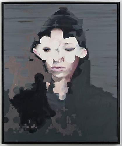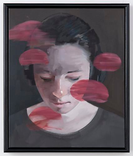 NL: Many of your paintings seem to have a surreal, somewhat sadomasochistic undertone. Latex masks, a bloody nose, a black eye, a face seemingly suffocating in bubble wrap. Would you agree? Or is this again an unconscious aspect to the work?