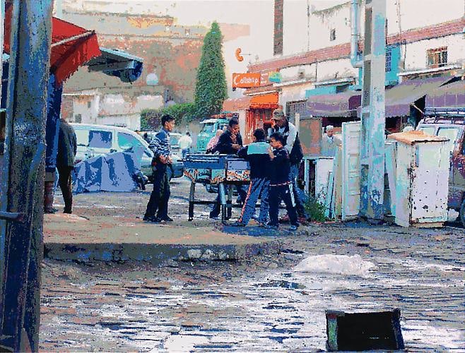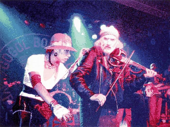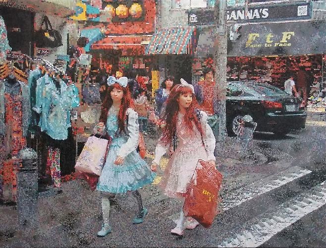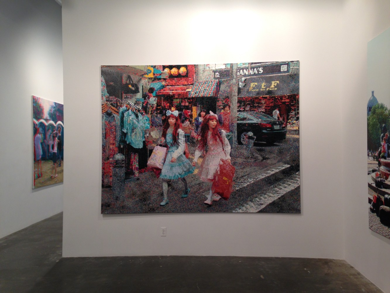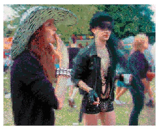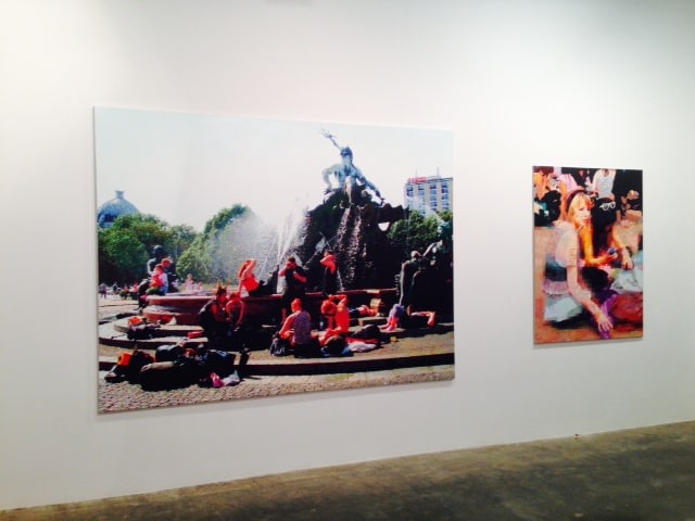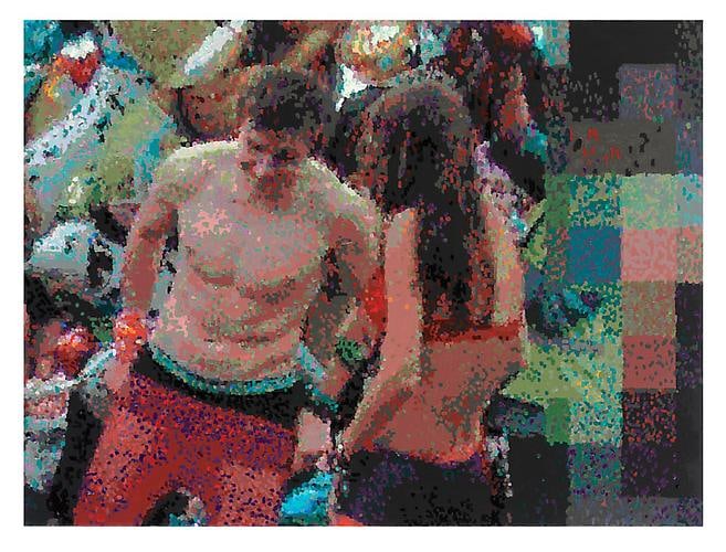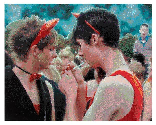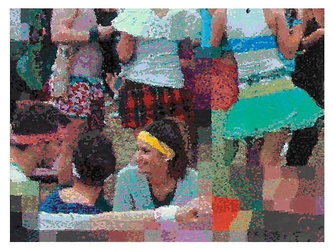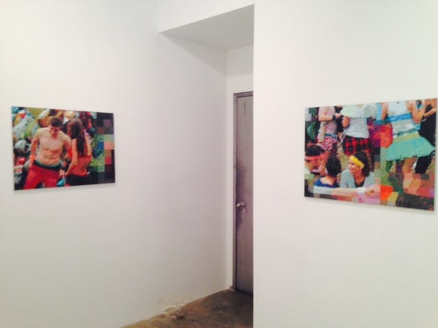 The work celebrates life on the edge; it starts off as an experience, then is captured in a photograph, and finally morphs into a painting. Like twin sponges the artists absorb their surroundings, whatever the circumstances might be: conflicts, parties, love, or wild absurdity. They create paintings that act as a kind of Polaroid. The colors are warm. The pixilation produces an aura-like quality that emanates from the figures. This quality harkens to the collective spirit and sense of humanity that the artists explore. Their work deeply investigates – and resonates with – what it means to be a human being today and how we act collectively.