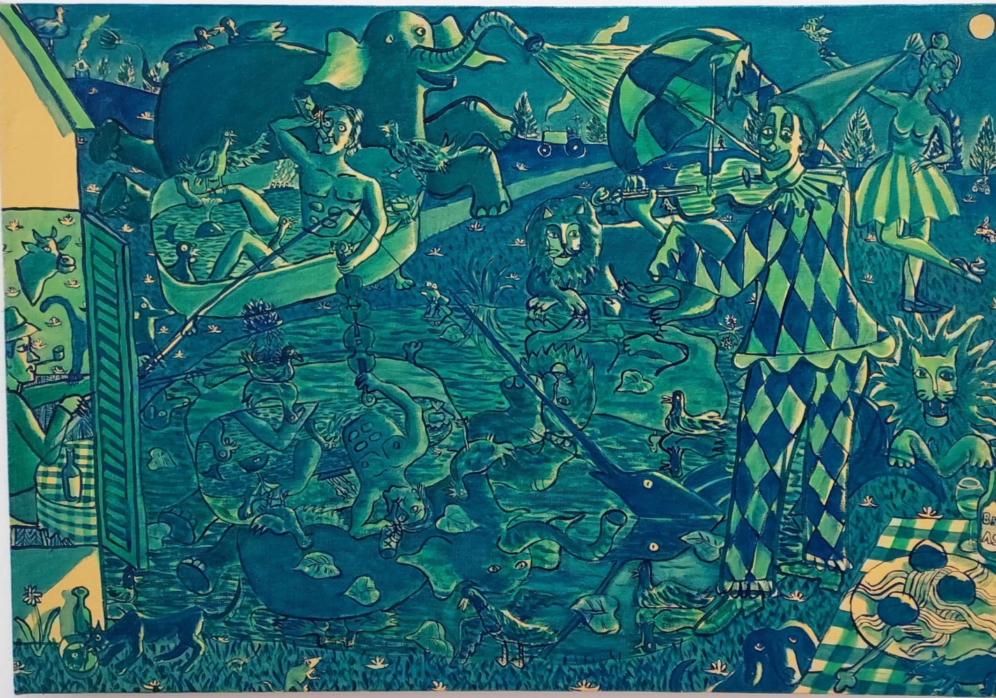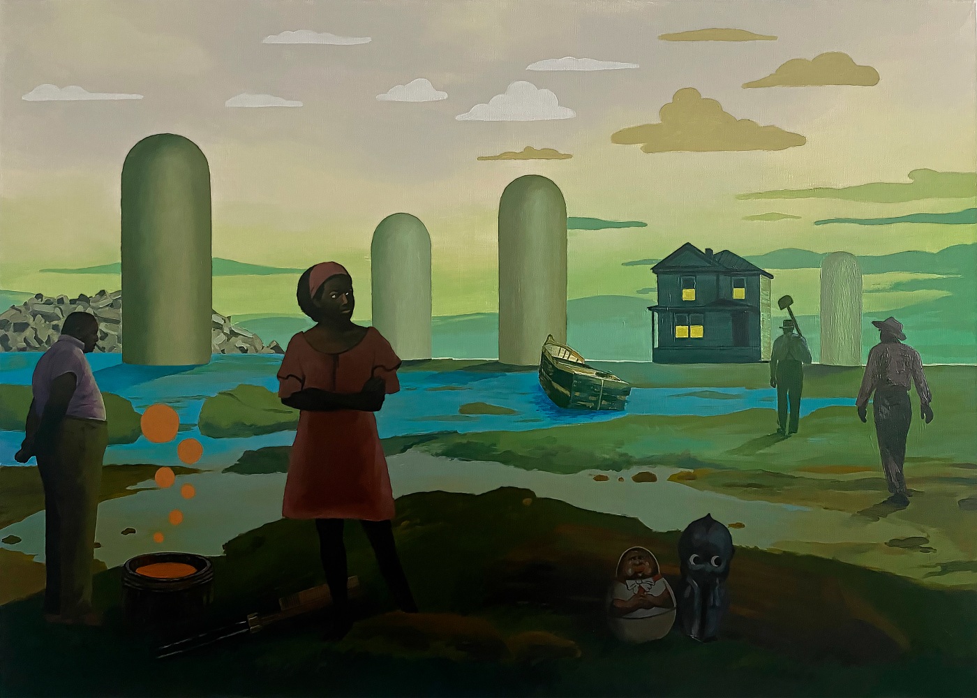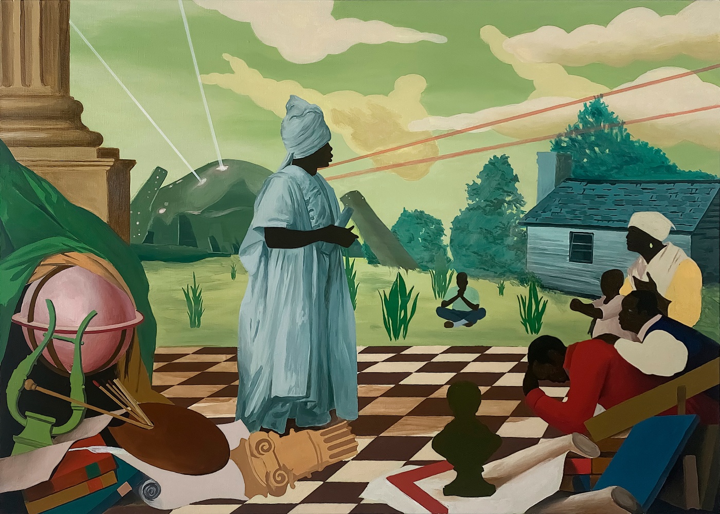 Mary DeVincentis and Ronald Hall depict a world which calmly assimilate inconsistencies verging on the surreal. The premise revisited across DeVincentis’s Harm’s Way Redux (2024) presents a kind of bureauphobia raining down on a world all but given way to nightmarish solitude. For his part, Ronald Hall, in works like New World Order (2023) delves into the legacy of racialism more generally both in the US and the West. Incorporating symbolism derived from Masonic traditions and from European ideals traceable back to the Renaissance, Hall points out numerous ideological incongruities, while also affirming the presence of blackness across the centuries.