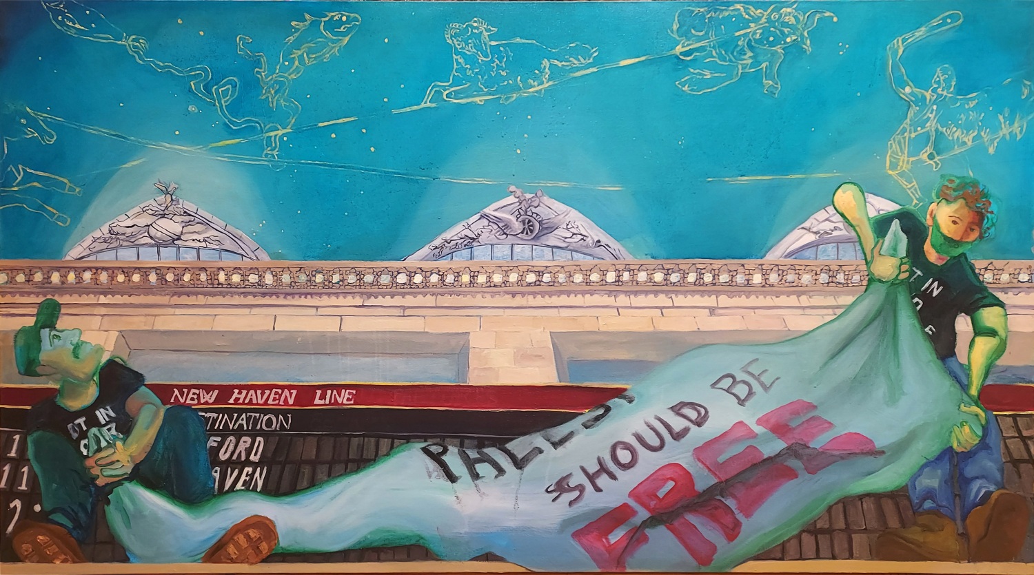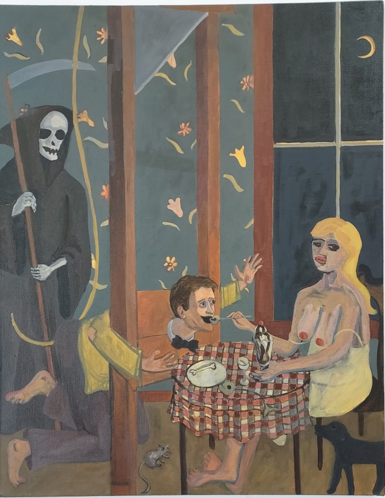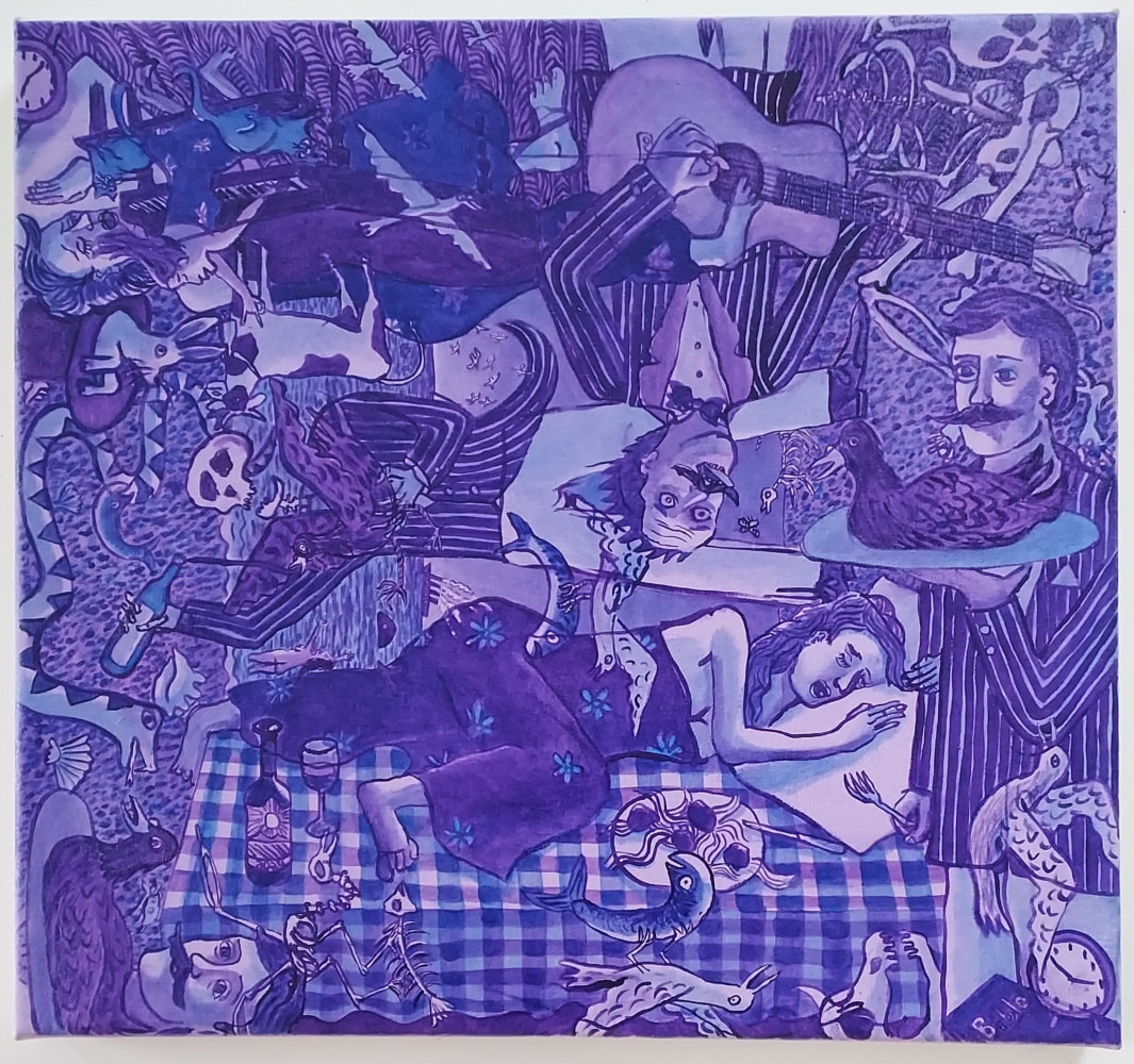 Mary DeVincentis and Ronald Hall depict a world which calmly assimilate inconsistencies verging on the surreal. The premise revisited across DeVincentis’s Harm’s Way Redux (2024) presents a kind of bureauphobia raining down on a world all but given way to nightmarish solitude. For his part, Ronald Hall, in works like New World Order (2023) delves into the legacy of racialism more generally both in the US and the West. Incorporating symbolism derived from Masonic traditions and from European ideals traceable back to the Renaissance, Hall points out numerous ideological incongruities, while also affirming the presence of blackness across the centuries.