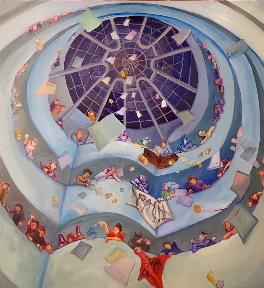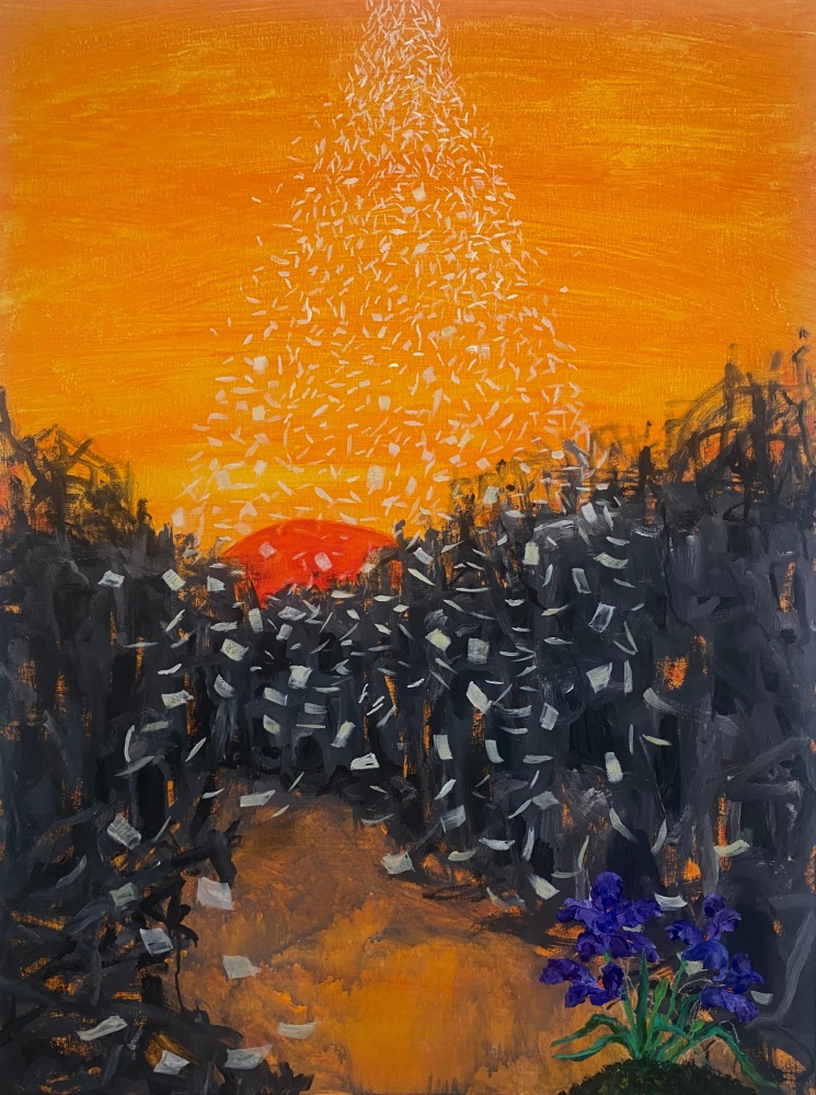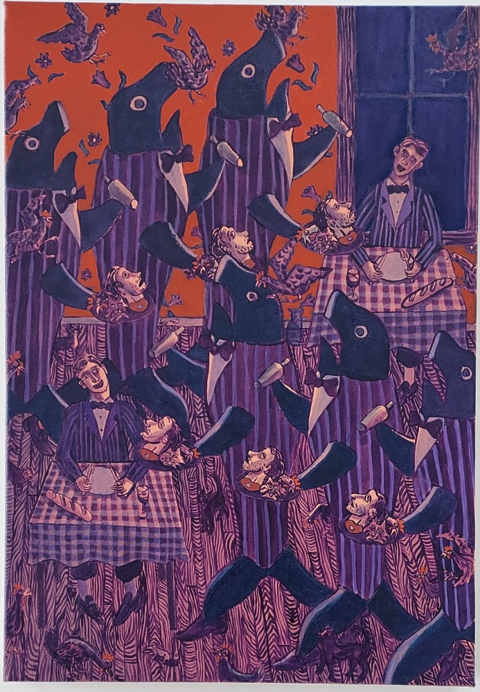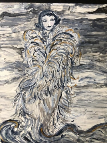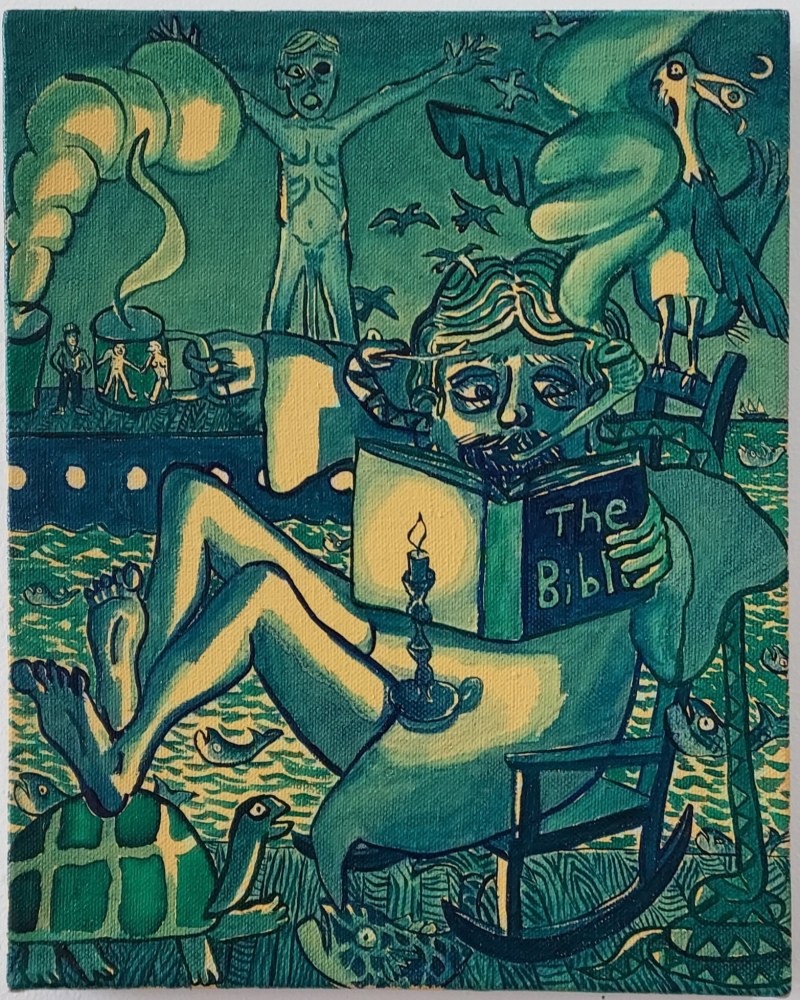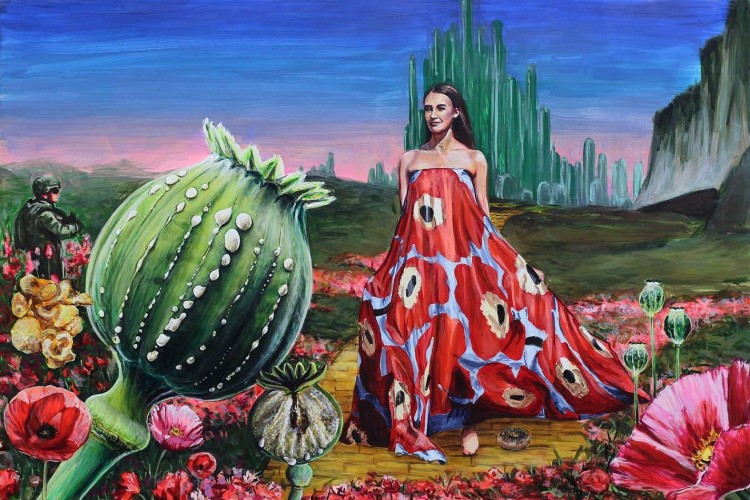 Just as Porter's novel presents a tapestry of human experiences, Ship of Fools showcases works from artists of various backgrounds, styles, and mediums. The exhibition explores imbricated themes of isolation vs. community, social as opposed to political commentary, and, finally, the emotional complexity embedded in our shared experience of pandemics, protest, and war. In this sprawling dystopia, satire becomes a lifesaving weapon. The maximalist portrait of Rose Briccetti's Opium Poppy (2024), provides one example of how painting, even if it cannot change the world, can certainly change how we see the world. Briccetti’s elegantly dressed central figure seems happily submissive to the cloying world of narcosis that surrounds her. Part Wizard of Oz, part Afghan theater of war, the fantasy aspect of the painting comments against the brutal realities to which it alludes.