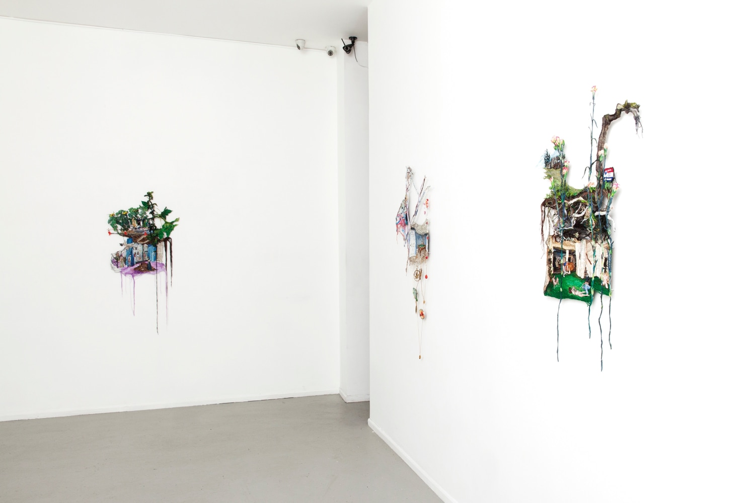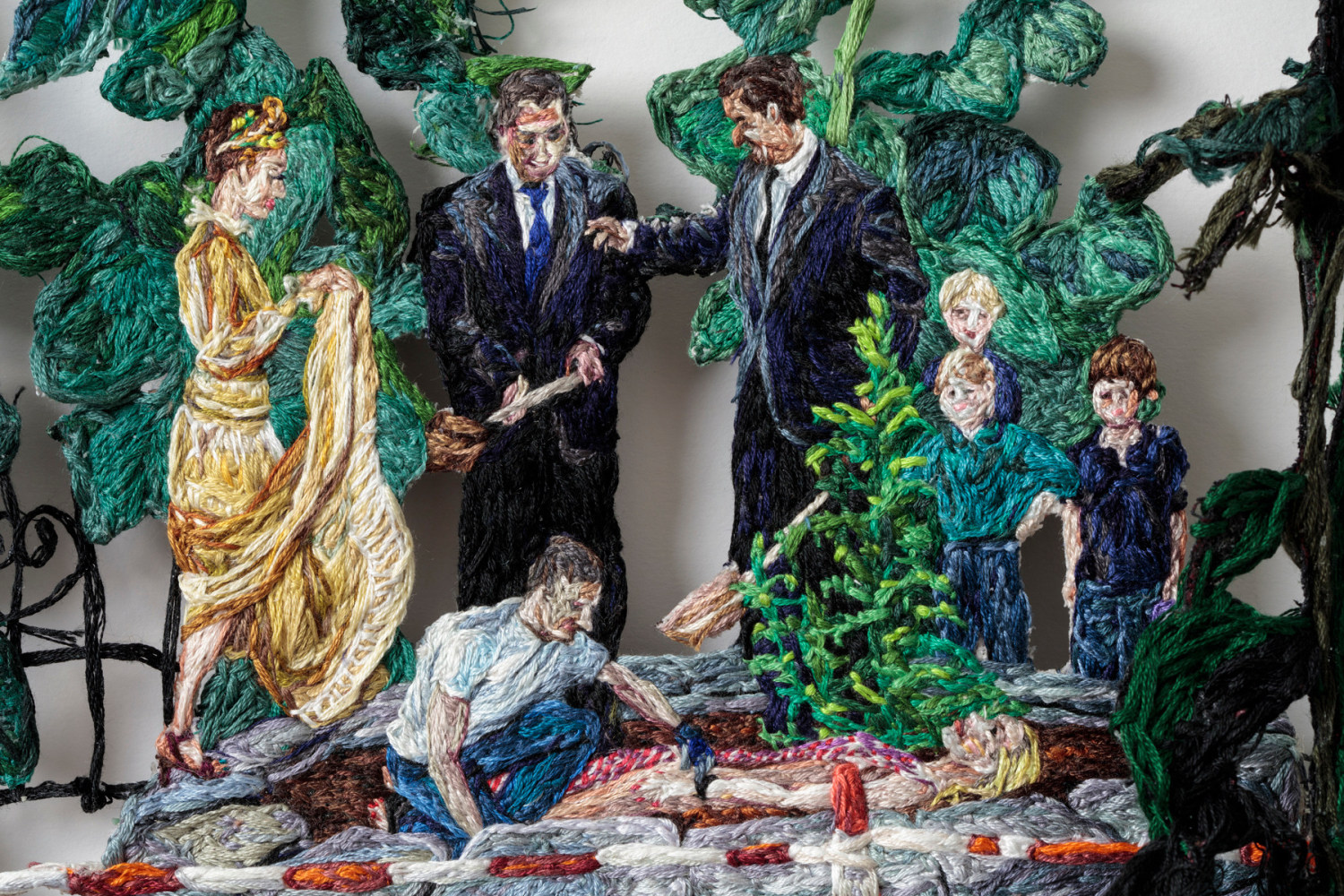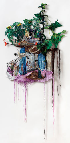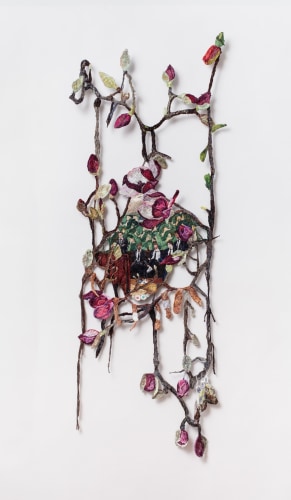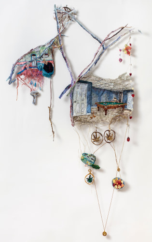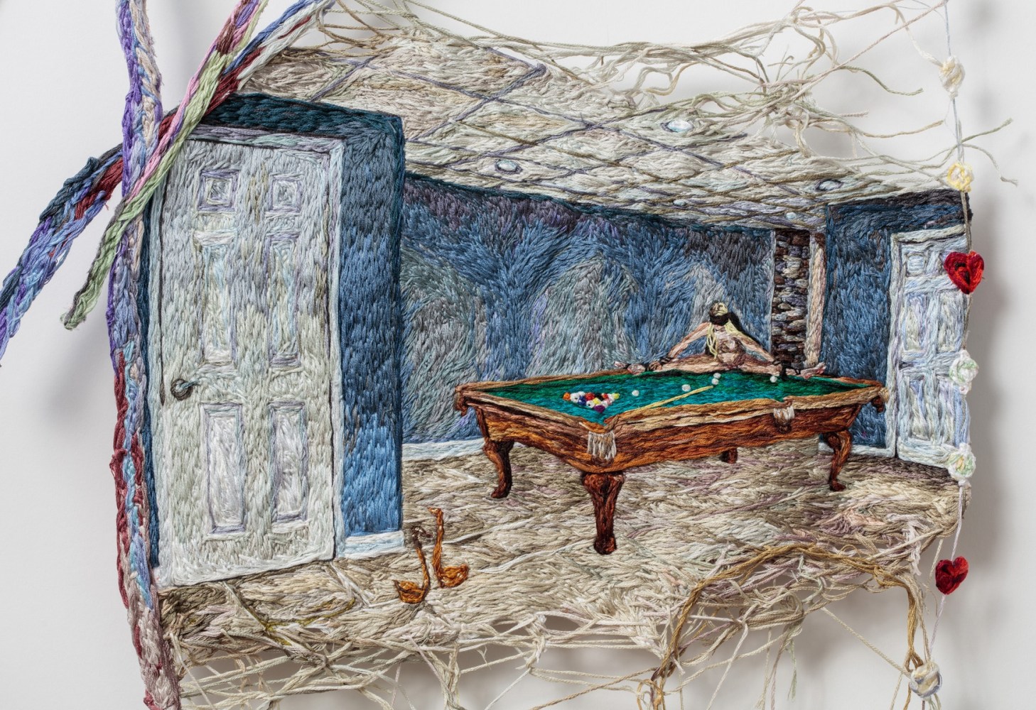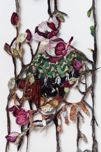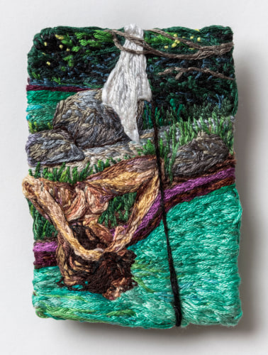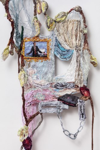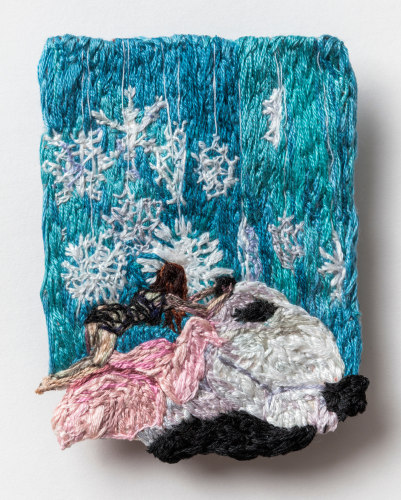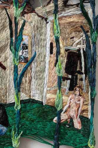 Early in the Game expands on themes common to Narrett’s recent work including escapism, desire, and the evolving nature of identity. Her highly contemporary narrative unfolds through the language of a deeply historical medium. Although the origins of embroidery date back to as early as 5th century B.C., it has a distinct socio-economic history in America, wherein prior to the implementation of a public education system, it was one of several formal skills young girls were taught in a spirit of homemaking practicality. Narrett redefines this conventionally domestic craft and imbues the work with a haunting cerebral quality. Her painterly approach to threadwork hints at the swirling, undulating mark-making of the Impressionists, while her images evoke the surrealist croon of Dorothea Tanning.