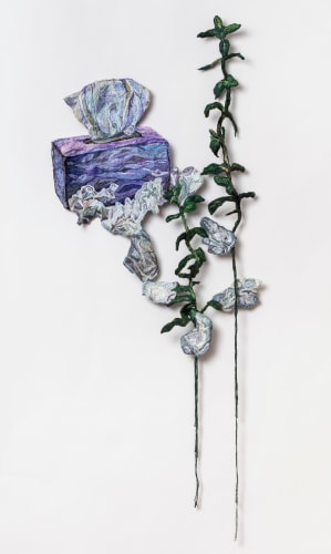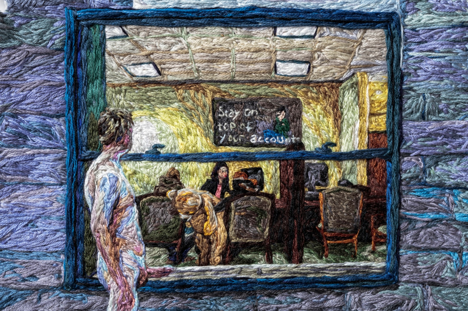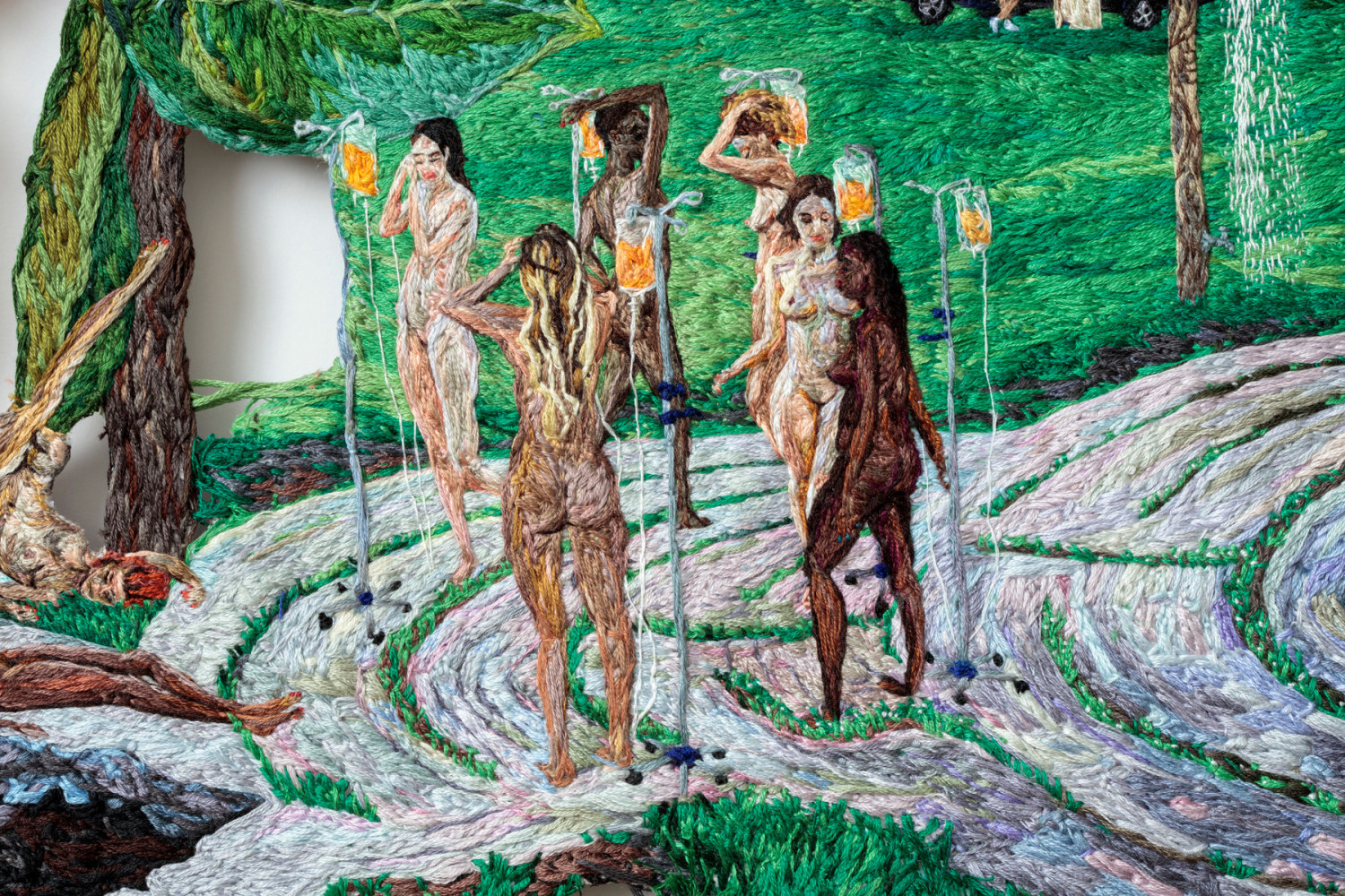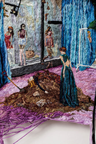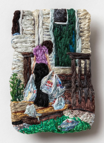 Although the warm thread constructs a personal narrative, the work opens itself to each viewer’s projections. The three phases of the story unfold as a collaged dream sequence, similar to the twisted composition of a David Lynch film. The characters’ behaviors are governed by a social code not easily hacked, and their features and bodies seem protected by the very thread that defines them. Each section is marked by the inclusion of a small embroidery serving as a narrative key. The first of which, titled Card One: Cry, depicts a woman on a porch amidst an overwhelming number of CVS bags. Her shoulders are slumped, her head hung in sadness as she resigns herself captive to the beauty products she just purchased.