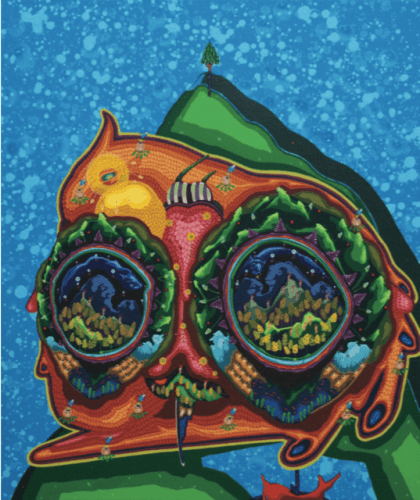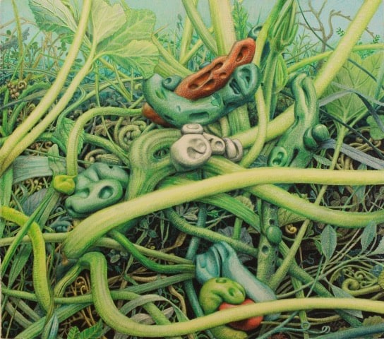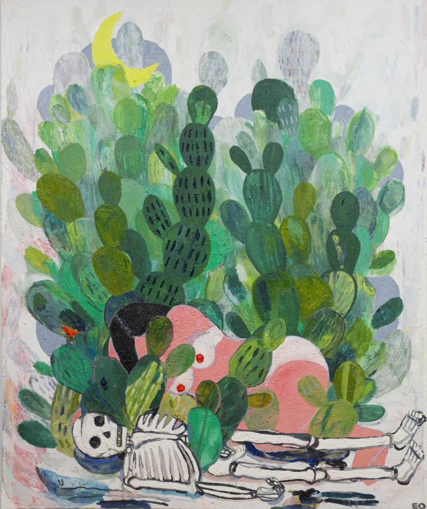 Plants make us human. The works in this show delve into the plant/human dialectic and celebrate the psychological spaces that plants help us create. Alexis Rockman’s animals and insects in a liquid, melting landscape and Emilia Olsen’s giant cactus with reclining figure and skeleton hint at the menace of a warming world. David Humphrey and Daniel Heidkamp present a more dreamy, bucolic state of mind amidst vegetation. Meg Lipke and Sangram Majumdar use plants as a vehicle for abstract paint handling. JJ Manford and Jennifer Coates explore a psychedelic vision. Plants get a thorough treatment in a variety of mediums, styles and scales.