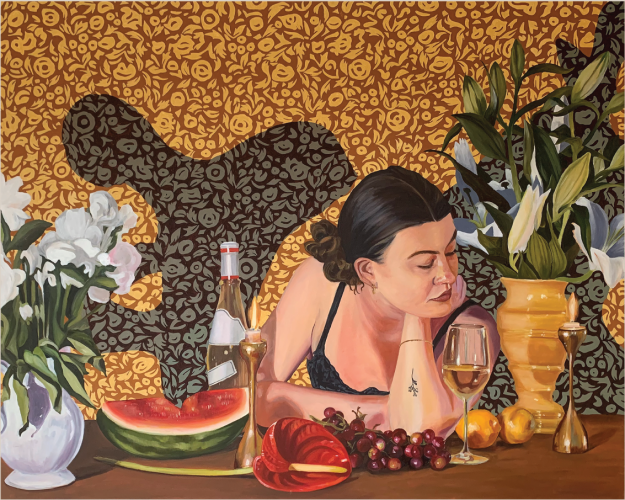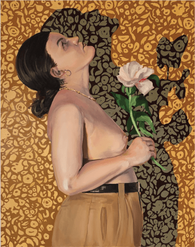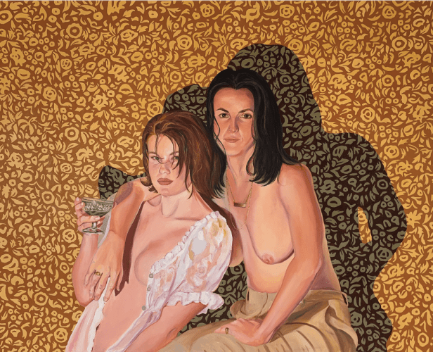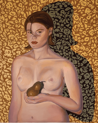 Choosing predominantly female subjects in a direct effort to confront societal anxiety surrounding female sexuality (save for Logan and Dillon, a double portrait of a male couple), Mulgrew carefully crops and poses her subjects, accenting faces, hands, and other loci of physical expression. In Leah, Regina, and Keara, the individual subjects gaze directly at the viewer; painted nude, or in the case of Leah, a state of undress, Mulgrew presents an aura of vulnerability removed from ideas of shame or modesty, instead suffused with self-confidence and inner strength. In Bridget and Amanda, the women are shown in profile, with their gazes averted; in the former, the subject stares enigmatically at a bundle of grapes, while in the latter, she looks upward, as if beckoned by an entity outside the bounds of the canvas.