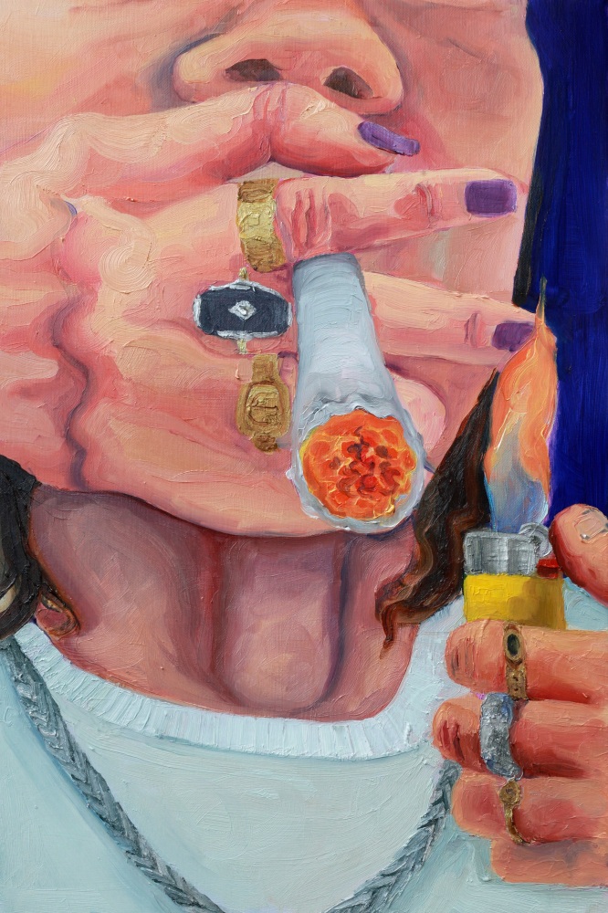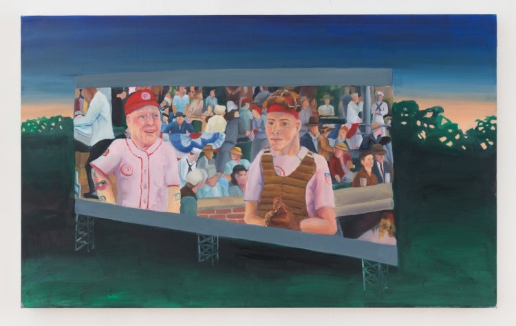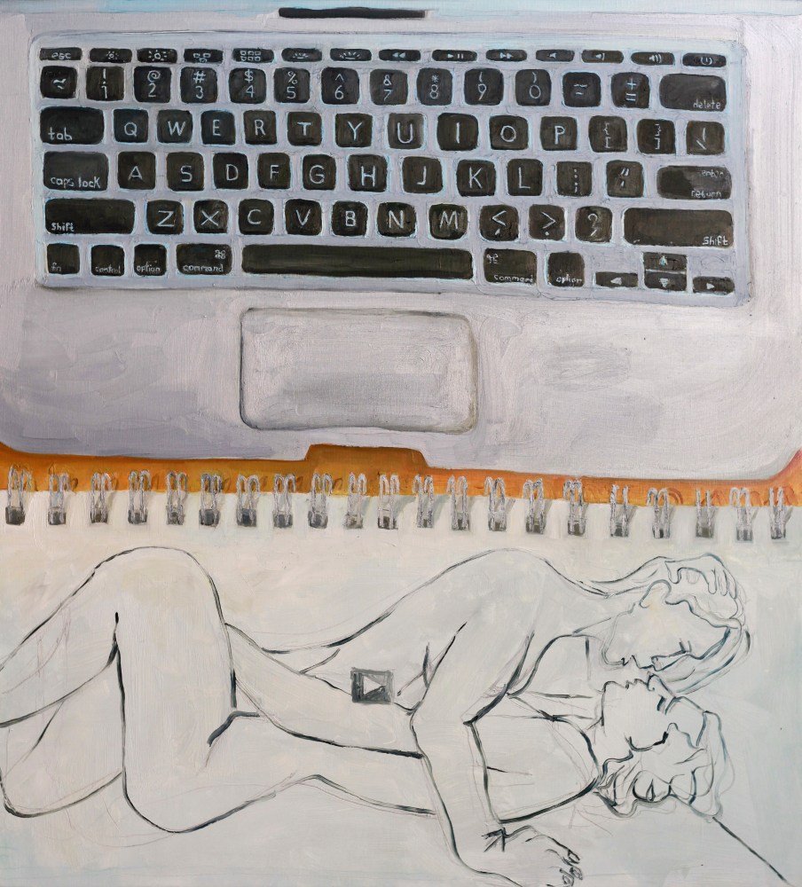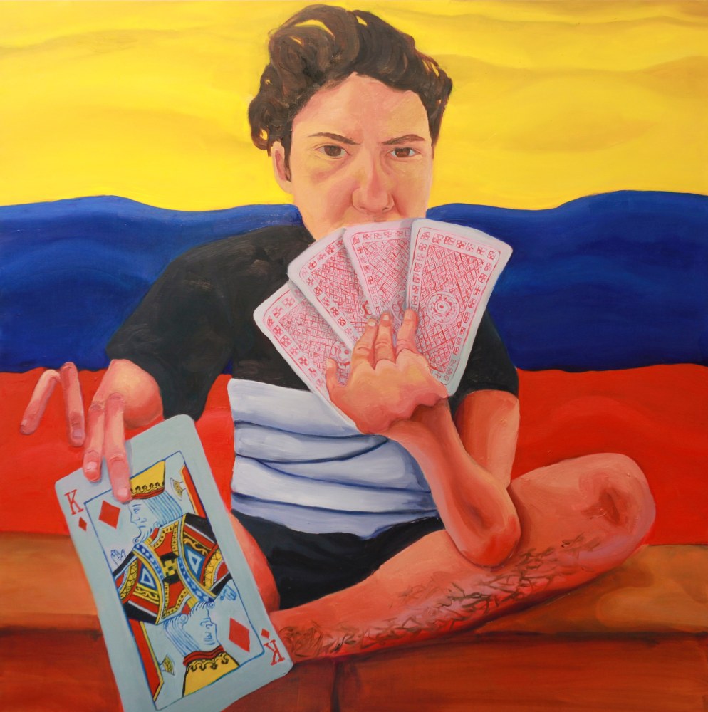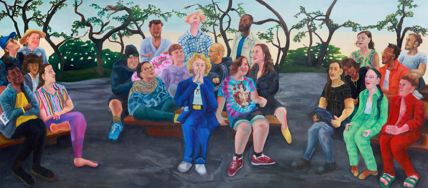 Until we enter the gallery, Tony’s community is the star of the show. Painted from memory, their expressions are amalgamations. The typically salient social cues of everyday interactions become skewed as the laugh of one day merges with the upset outcry of another. Like all of the other paintings in the show, Set and Setting is painted from first-person perspective. And like the other paintings in the show, the perspective is not Tony’s alone. Members of Tony’s community are gathered within the shared frame of an outdoor theater, playing a mutual-game of make believe, and we are called in to do the same. Standing in front of Set and Setting, presumably on center stage, we return the audience’s gaze, a mutual looking between two subjects. It is a fun-house mirror of witnessing and being witnessed that is ever exponential. And it repeats throughout the show as the role of the viewer shifts from work to work; the filmographer in The Passenger, the friend about to lose in The Gambler, blocking the wind in Ritual, googling “lesbian sex” in I Just Googled “Lesbian Sex”. The viewer is the final—and necessary—participant in Tony’s paintings, their role to complete another cycle of relationships as they stand before the paintings and watch them progress.