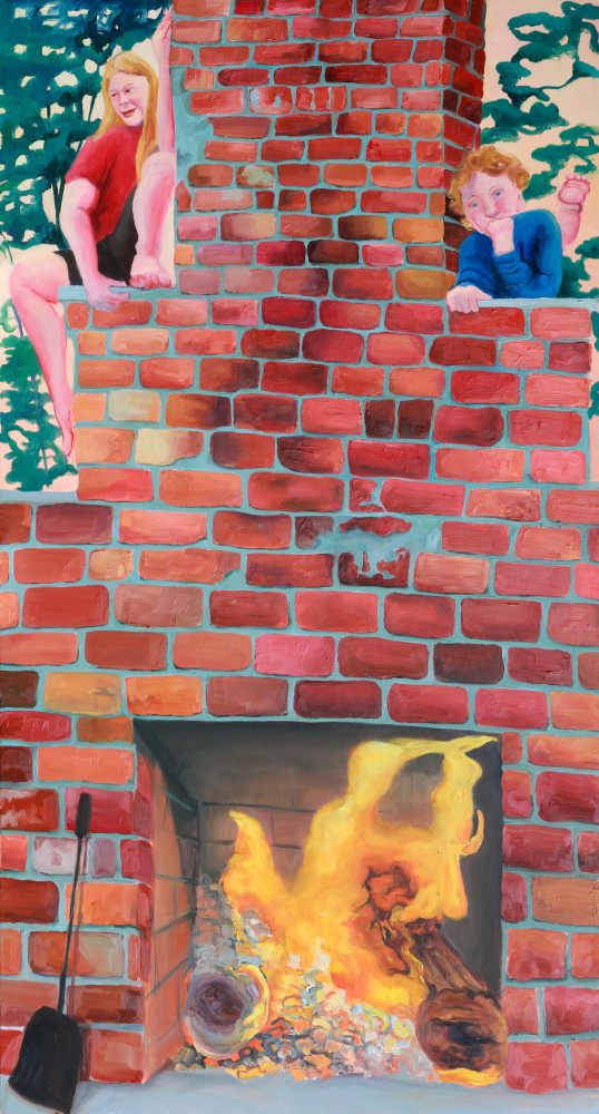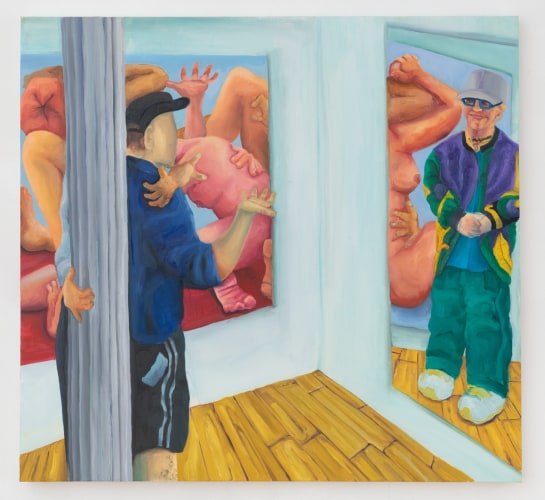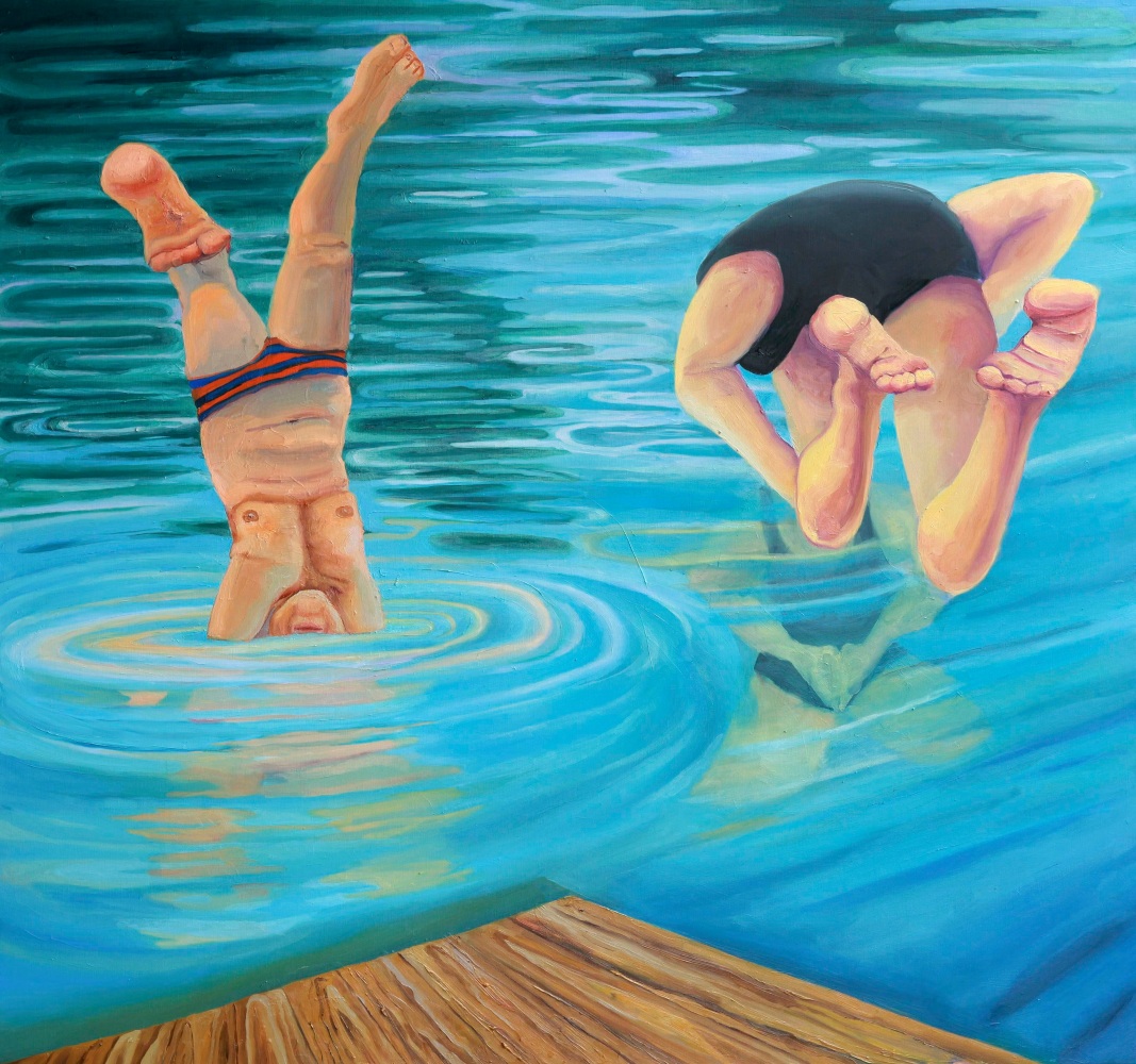Tony’s whimsical manipulation of pigment and line (a blob a torso, an arm more color than strength) is not a shrug of indifference to form but, instead, the exact opposite, a spotlight on the emotional and structural qualities that turn the vibration of shapes and colors into a person's experience of themself and the world. In Little Deaths, Tony reanimates the experience of a person diving, of their friend diving in first, of Tony recalling the memory, so that the vantage point of the painting gets constructed out of this collaborative experience. There is a synthesia at work; watching the painting feels like, no, is the dive—the curled toe, the fear when you start to jump, the ecstasy in the plunge, imagining someone watching you and someone watching them, the momentary oblivion of immersion. The diver in the painting is about to splash into their reflection (which in a comedic twist, has much better form), their relationship to their reflection is the catalyst for the disturbance to an otherwise calm surface, a literal and metaphoric ripple effect.