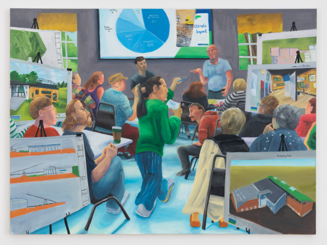 So many! Tony could render the world exactly as it is, frame the social agreements of how things happen—how a body sits, a cloud billows. (Ask to see Tony’s sketchbook, the early drawings for these paintings are uncannily lifelike, as though charcoal rubbings of a moment.) But what’s the point in portraying a world people already believe in? Instead, Tony applies this virtuosity to looking at the shadows and highlights that, through their relation to one another, create an instant. Tony is working hard in these paintings, making sure we don’t forget that through our relationships we can re-make the world. These luminous reinterpretations of daily life are vibrating reminders of a specifically queer effort to resist the received structures of the ‘real’ world, proposing a shift in perspective every step of the way. Make-believe till you make it believed.