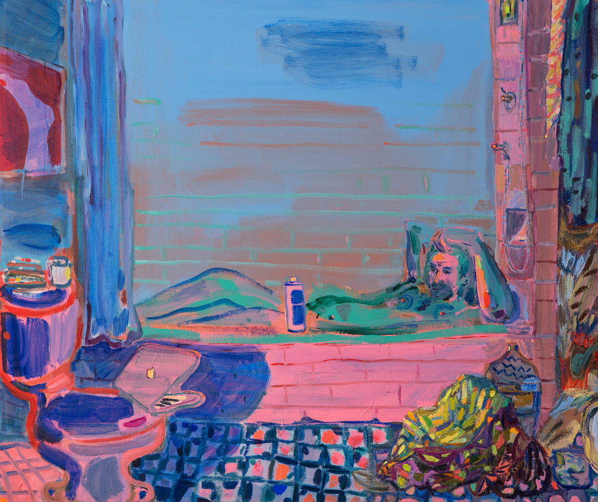 Lisa Sanditz presents a new shift in her oeuvre, from “connecting outward to inner, in location and self”. Catalyzed by a desire “to paint something different and to consolidate my personal life into a very intimate domestic world”, Sanditz’s paintings in Waking Dream traverse an array of domestic environments, from the “mancave” to more intimate (and perhaps voyeuristic) bedroom and bathroom scenes. In A Possible Christmas Dinner and Suburban Basement Snakes 2, she suffused stereotypical suburban imagery with a menacing tenor. In the former, the faces of the family members are smudged and obscured, and a body lays under the dining room; meanwhile, in the latter, the subject has a riddling and seemingly incongruous collection of snakes. By framing the structures of domestic life as environs rife with psychological energy, Sanditz queries the viewer to interrogate their relationships with their own abodes, particularly the ways in which they channel certain psychological states.