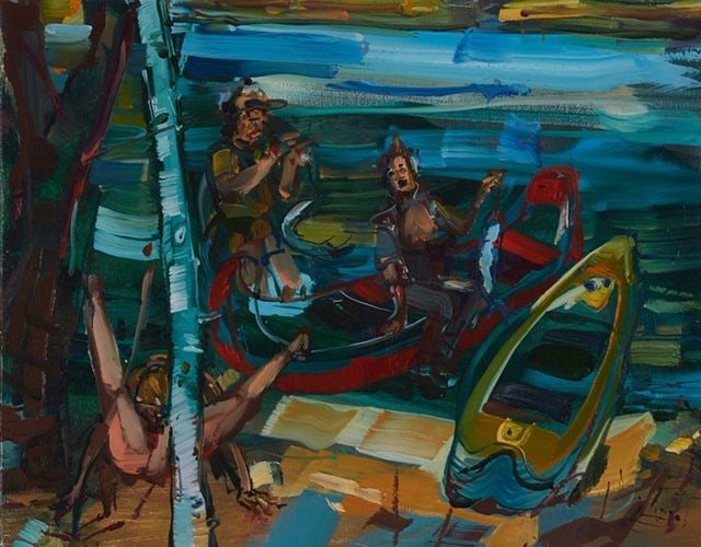 Characterized by impasto brushwork and a hyper-saturated palette, Elizabeth Huey’s paintings hone in on the dynamic interpersonal relationships, empathy, and human connection, often situated within fantastical, surreal dreamworlds that oddly parallel reality. Huey’s work beckons the viewer to indulge in escapism and sonder; interestingly, there are seldom elements of voyeurism in her work, with a sense of welcoming invitation prevailing. For example, though One’s Own Masquerade presents an orgiastic scene replete with tokens of blasphemy and sexual depravity, it projects a jovial, carnival-like atmosphere. In her other works on display, Huey depicts similarly enticing and imaginative psychological playgrounds.