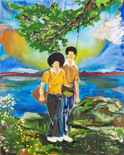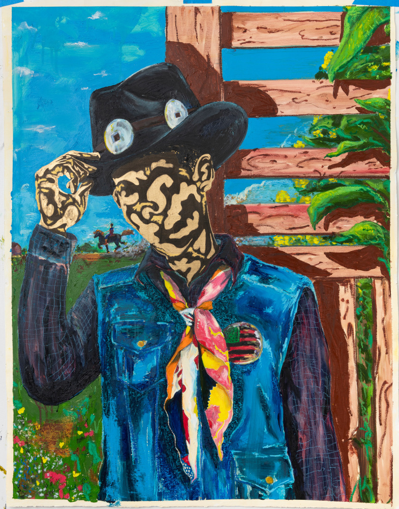 The air of intimacy communicated through Watson’s canvases only partially derives from allusions to historical contexts. Often enough, the authentic meaning of his works only unlocks itself in connection with the titles attached to them. In Silence Is the Way of the Sunset, for instance, what initially reveals itself to the viewer is the sheer iconicity of the painting. Four figures rest foregrounded against a backdrop replete with social significance. From the figures gardening, or just going about their day—everything has a socially constructed meaning about it. But the artistry of the work falls outside the province of sociology.