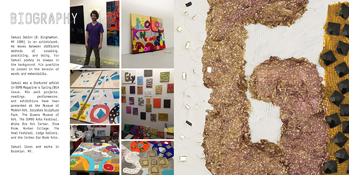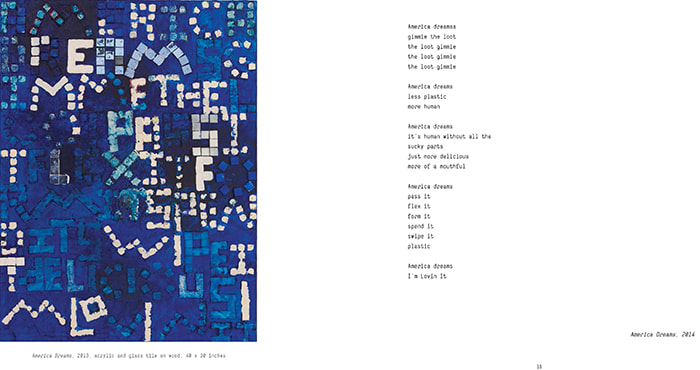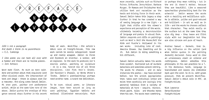 "Samuel Jablon actually makes his words from scratch, fashioned out of mundane materials and sometimes almost nothing. The words he chooses - and in many instances the poetry - may have existed before, but the artist appropriates them, takes each individual letter and molds them carefully and lovingly into personal tableaus from a variety of materials at hand - sequins, mirrors, thick paint, tiles – and thereby makes them his own. The words mean something,